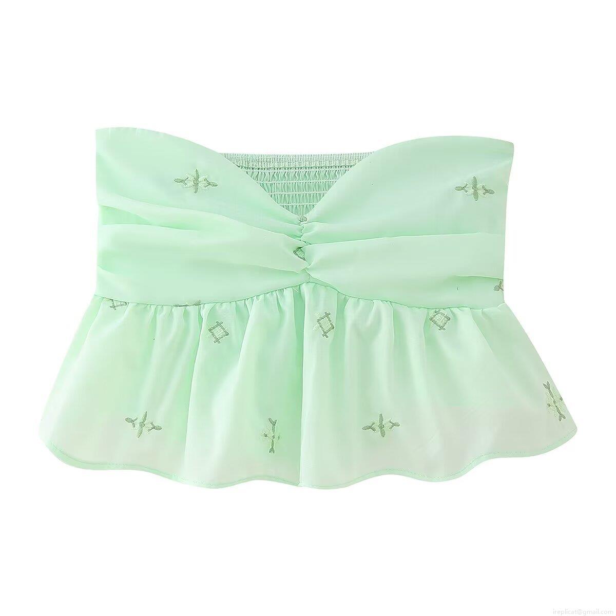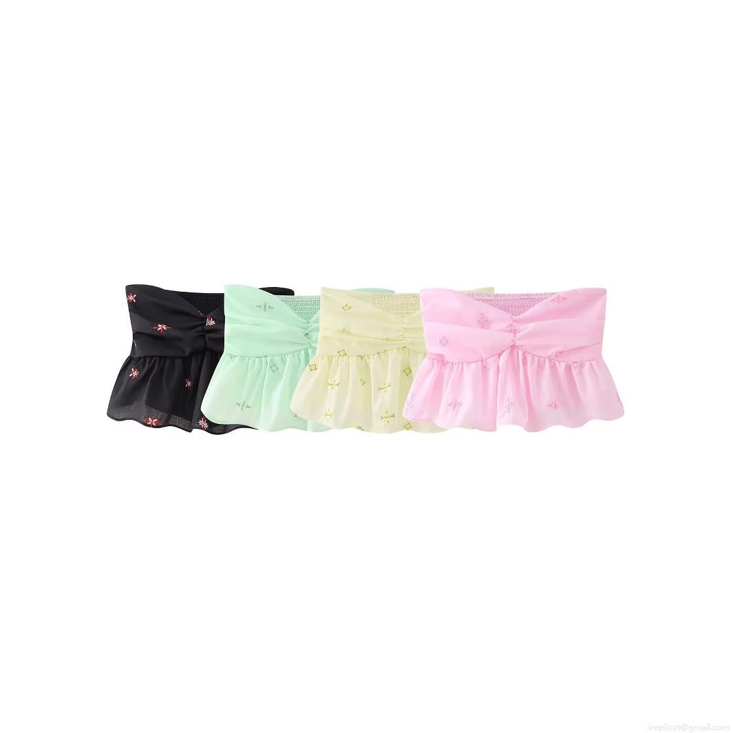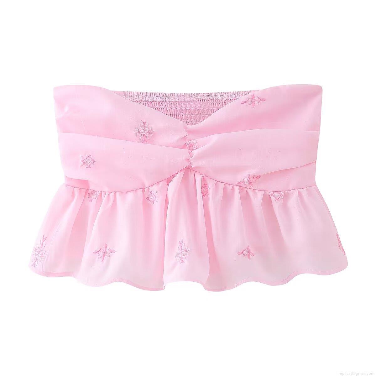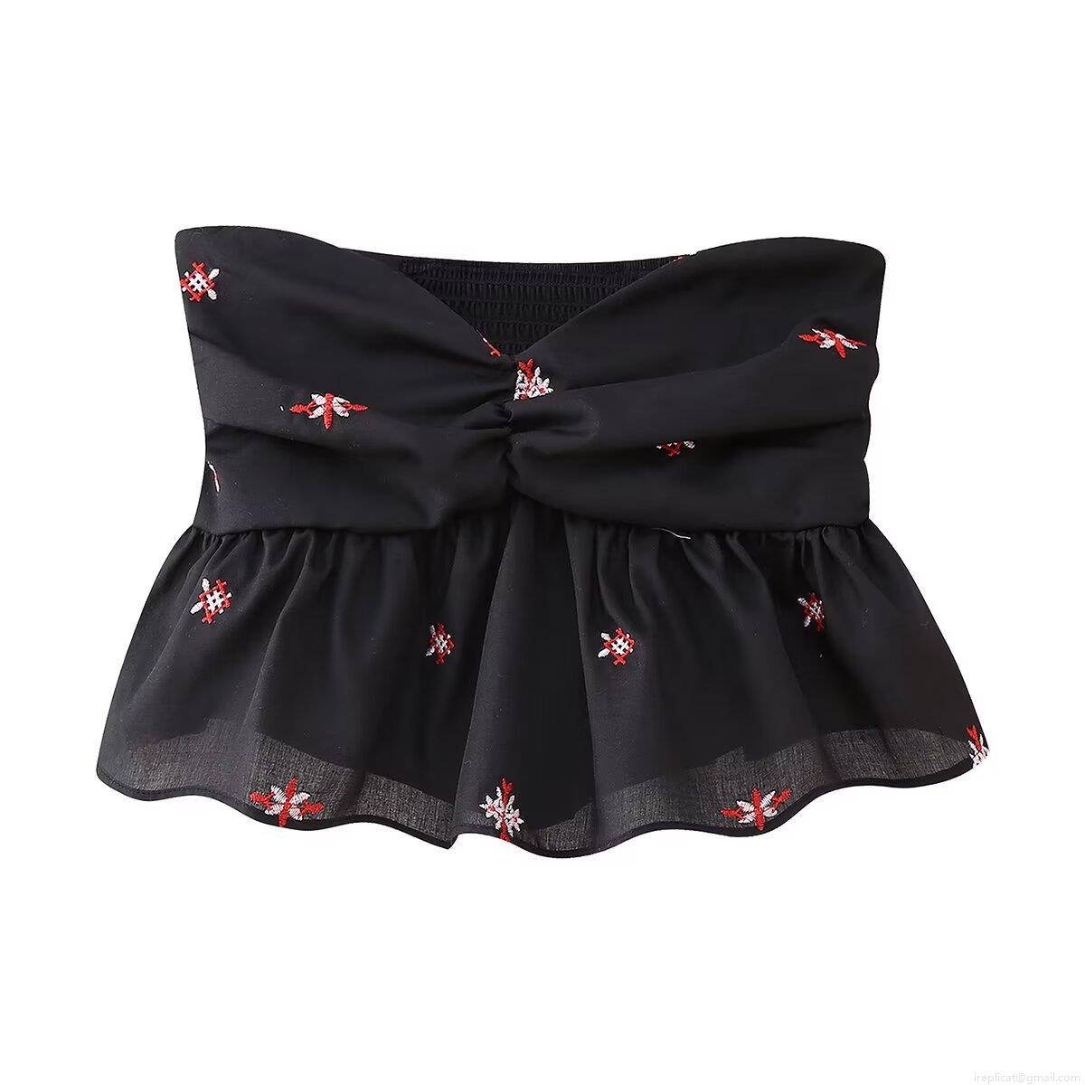 • Women's Embroidered Tube Top 100% Polyester Strapless Ruffle Hem Smocked Crop Top Sweet Floral Twist Front Sleeveless Summer Blouse For Women Party