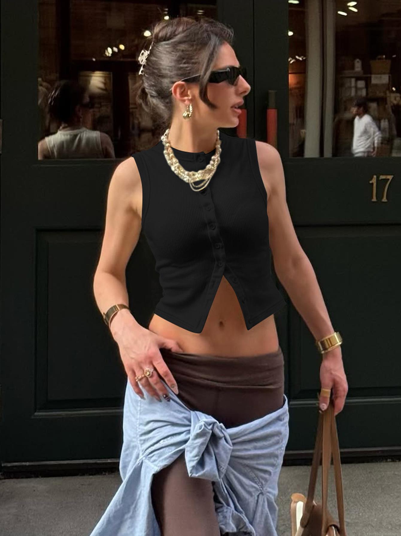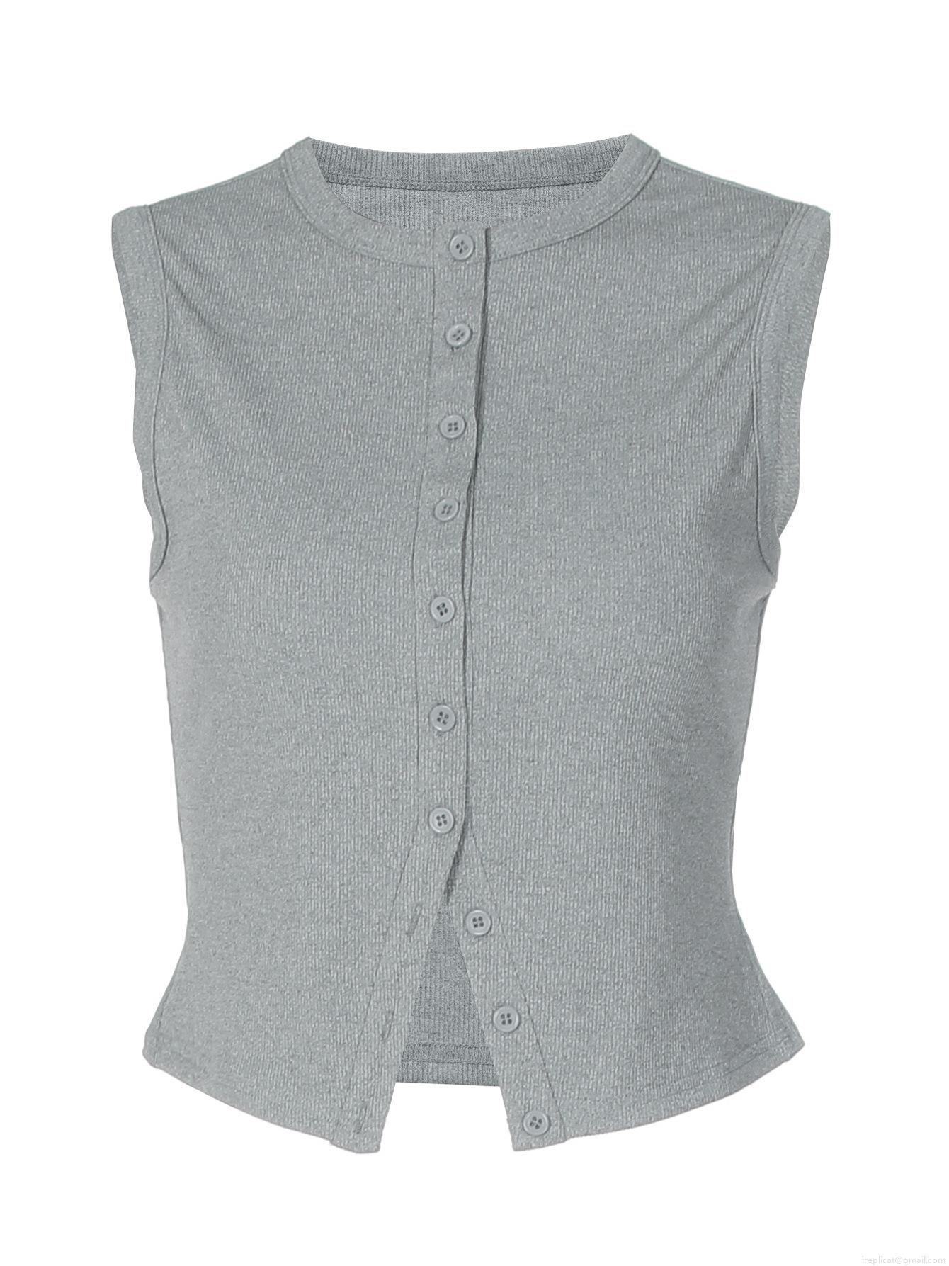 Women's Fashion Rib-Knit Button-Down Tank Top Sleeveless Slim Fit Polyester Spandex Blend Casual Street Style Vest Crop Top for Women