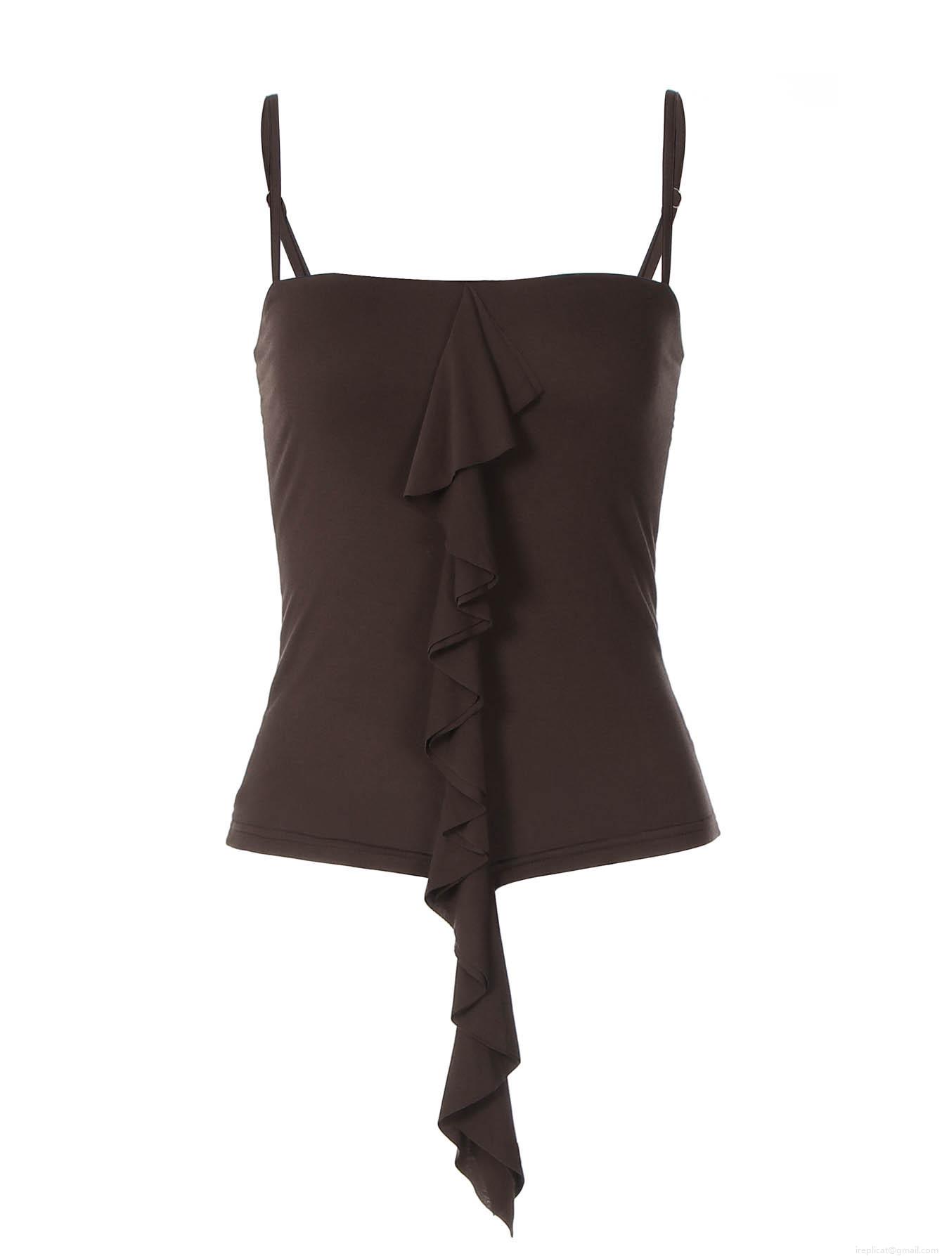 • Women's Fashion Ruffle Camisole Sexy Slim Fit Rayon Spandex Sleeveless Tank Top For Summer Street Style Coffee Brown Suspender Top