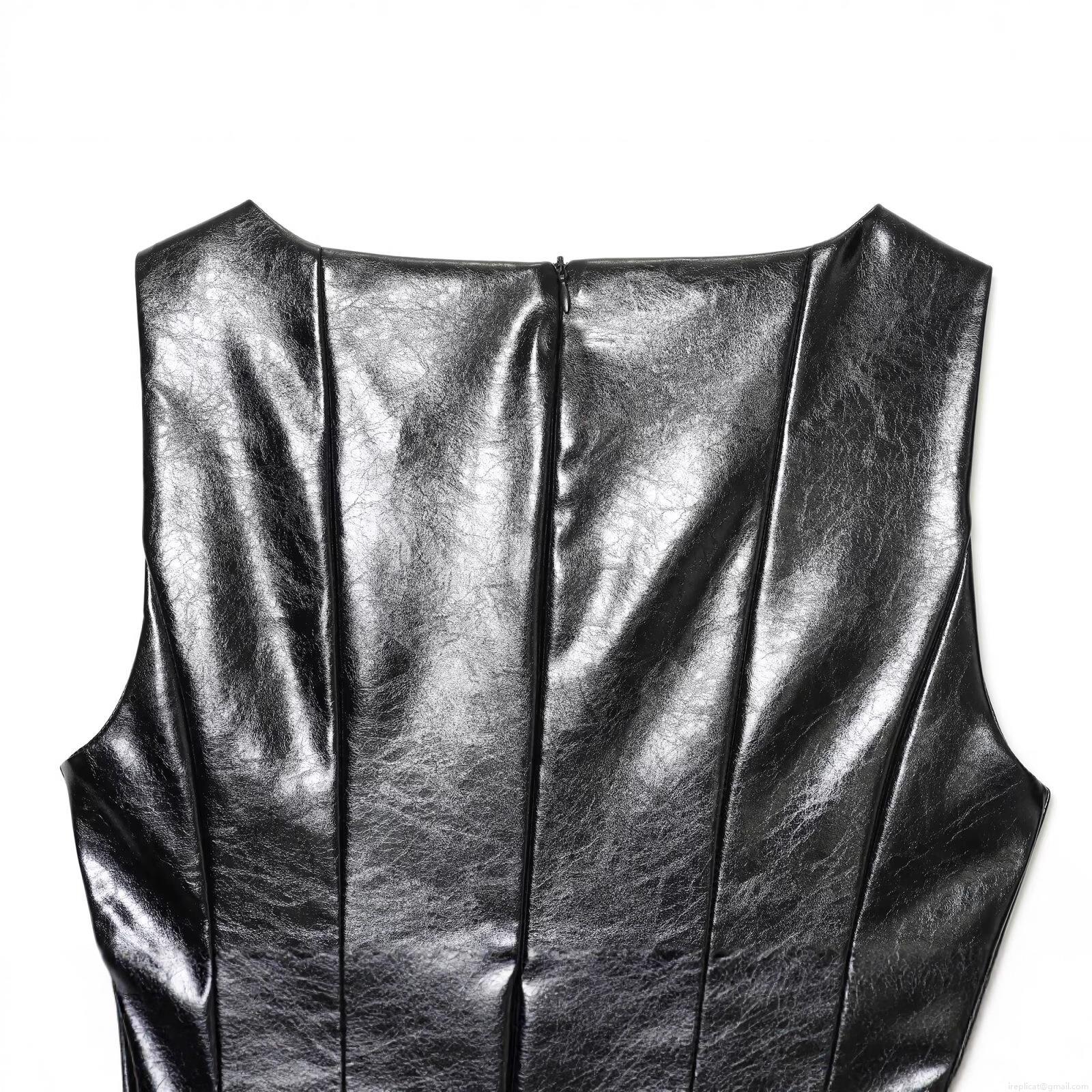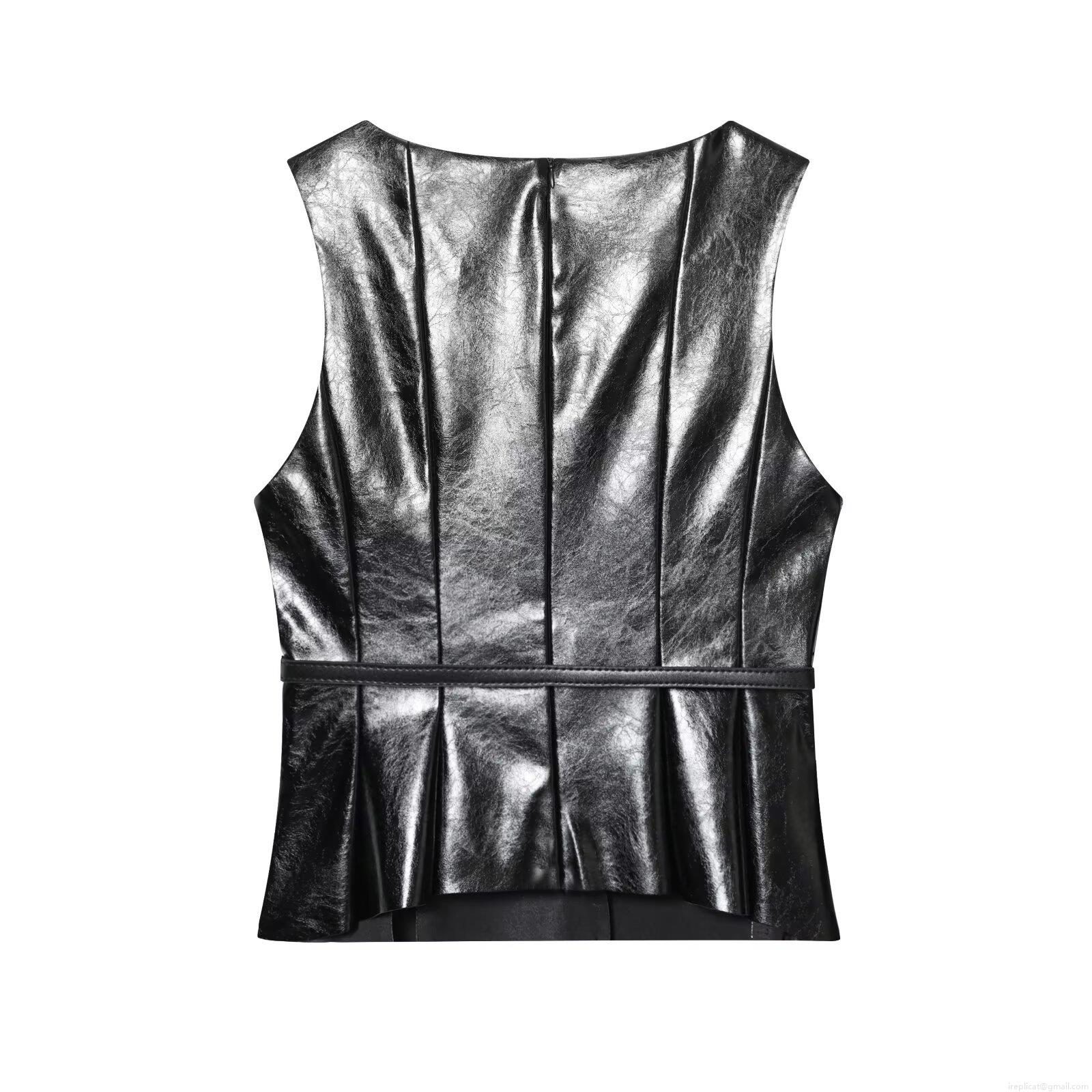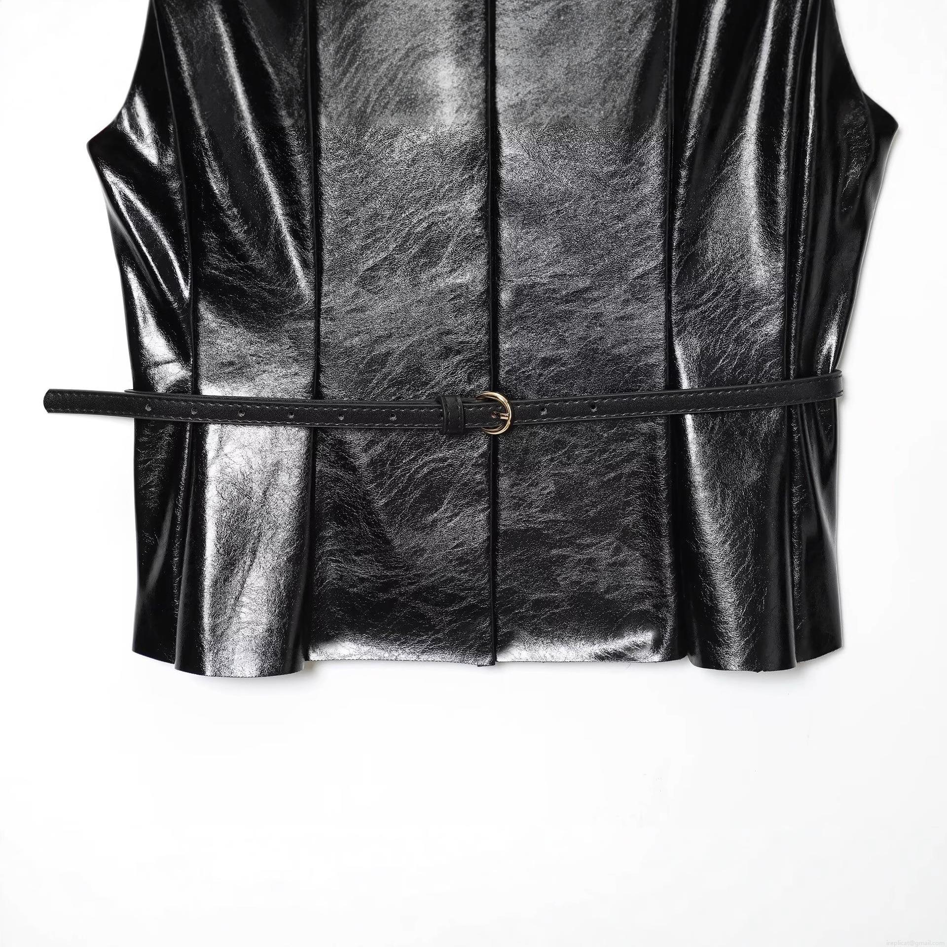 • Women's Faux Leather Sleeveless Top With Belt Chic Black PU Leather Round Neck Peplum Waist Vest For Party Daily Streetwear Ladies Elegant Fashion