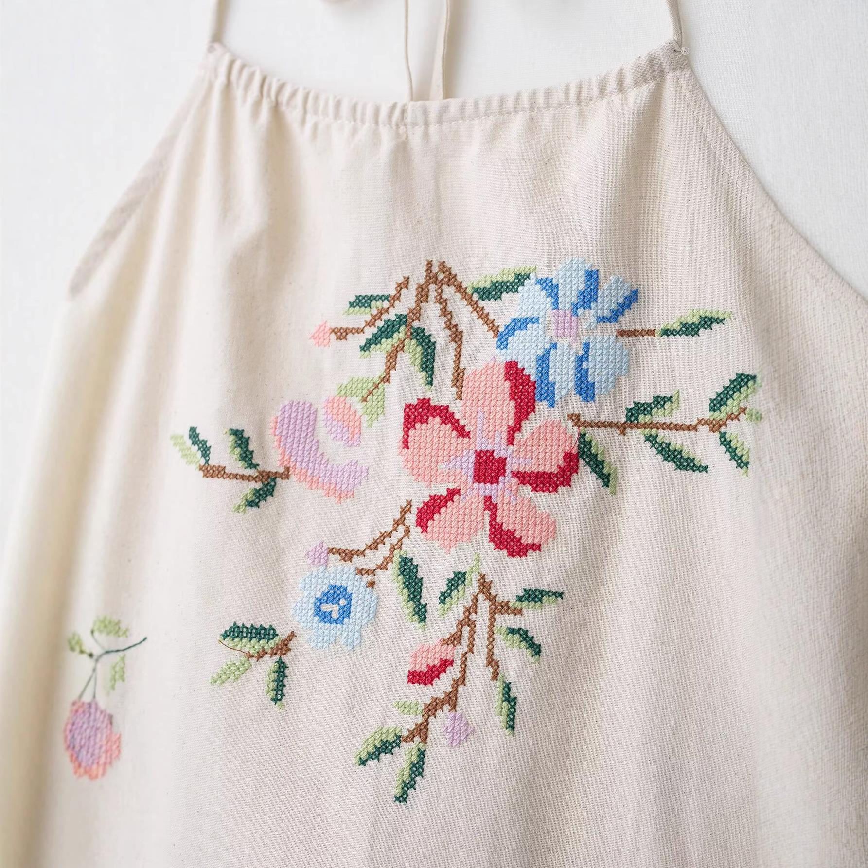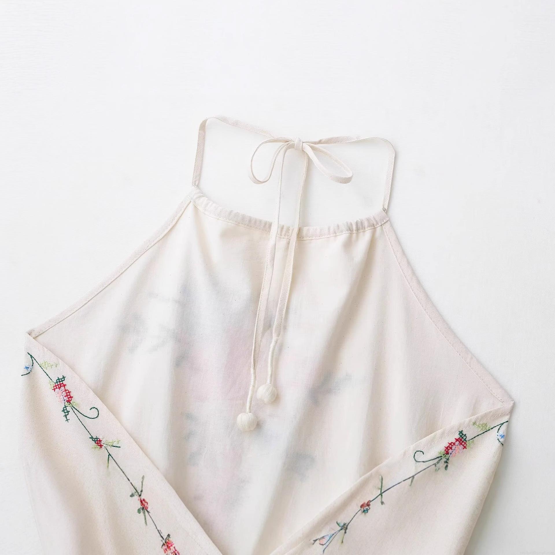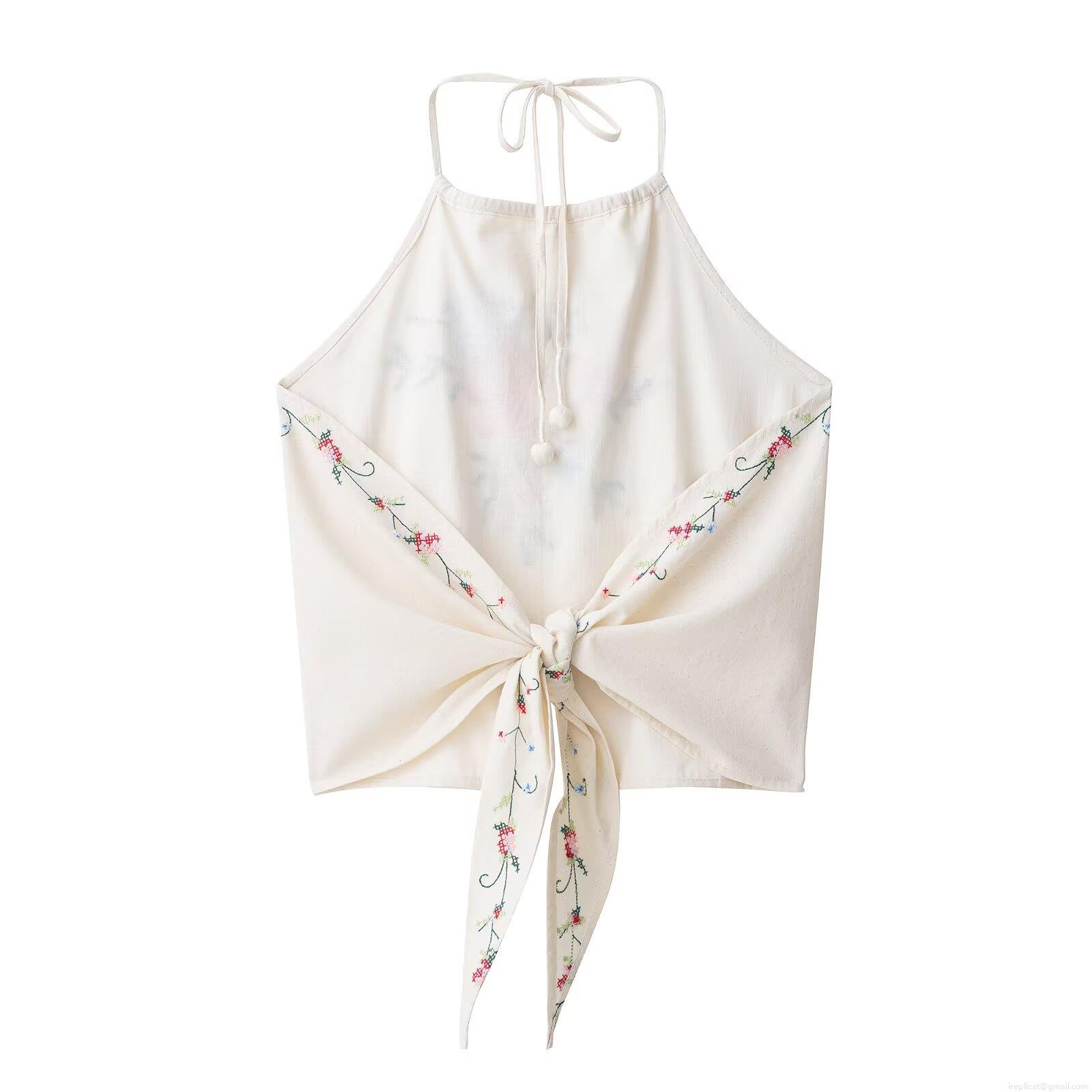 • Women's Floral Embroidery Halter Neck Crop Top Beige Polyester Backless Tie Up Sleeveless Tank Top for Summer Vacation Streetwear Sexy Y2K Style