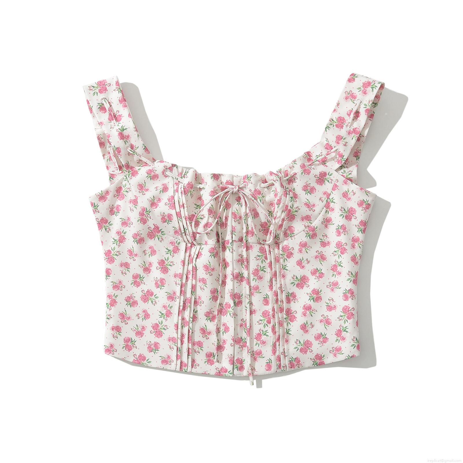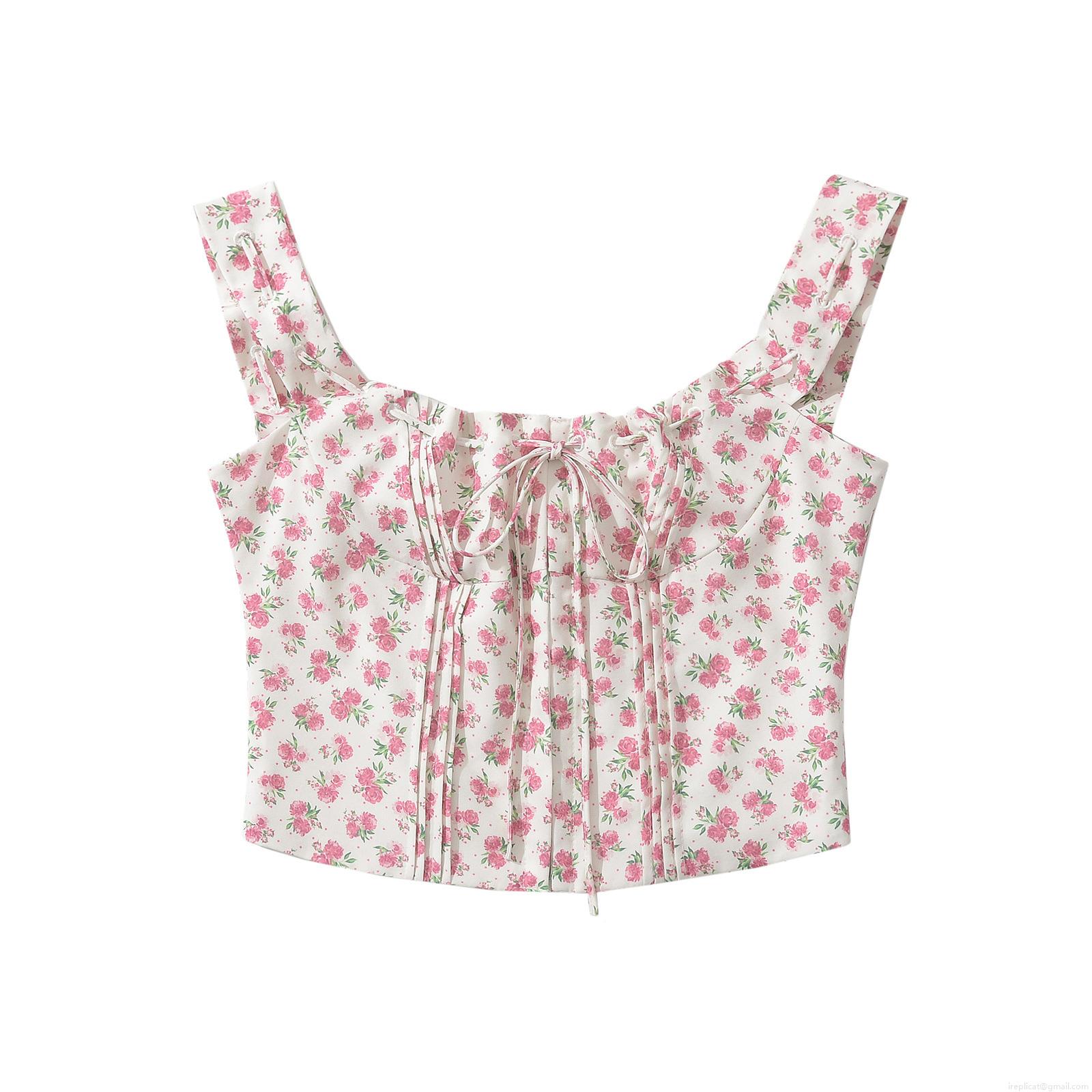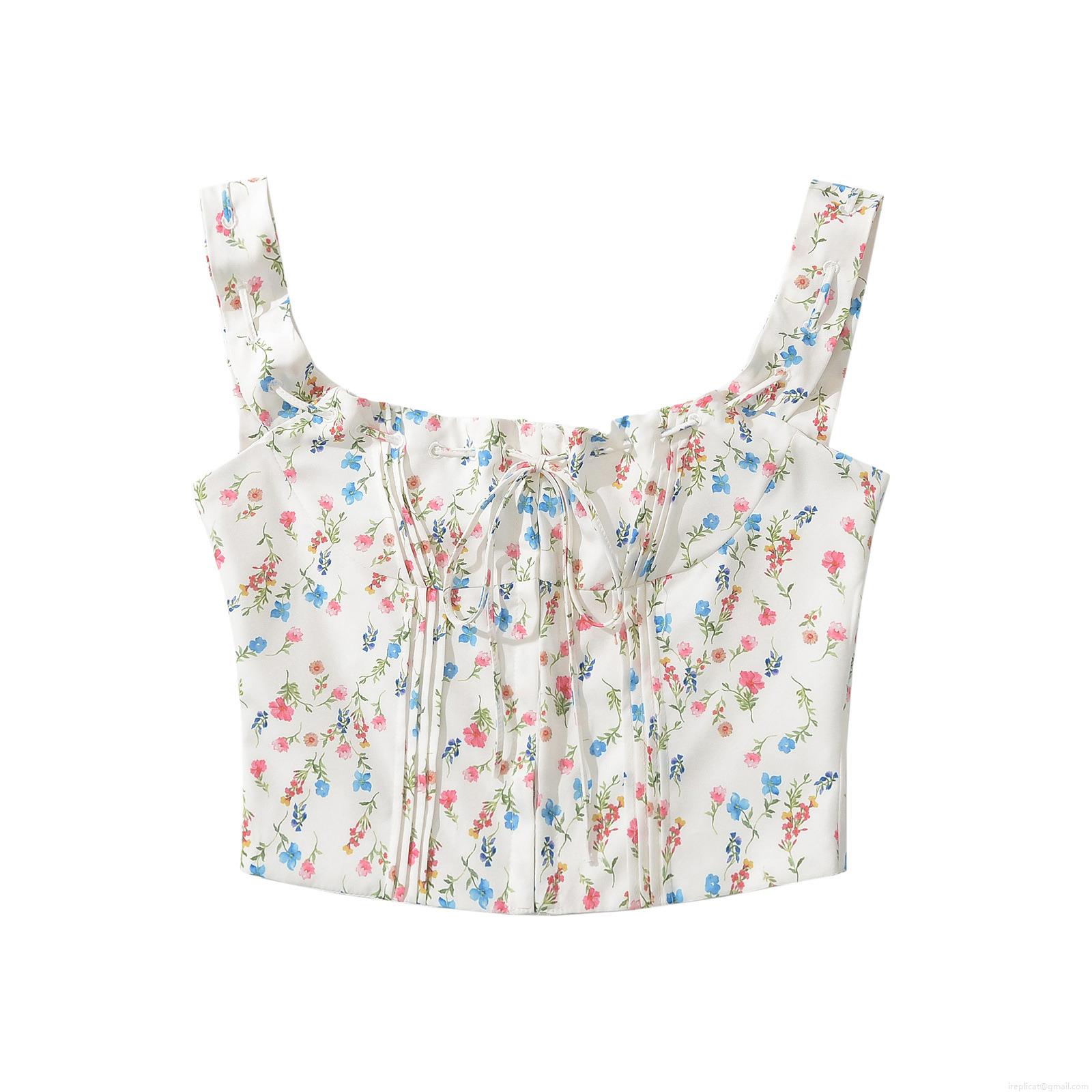 Women's Floral Print Camisole Polyester Tie Front Shirred Cropped Tank Top Summer Casual Streetwear Sleeveless Shirt