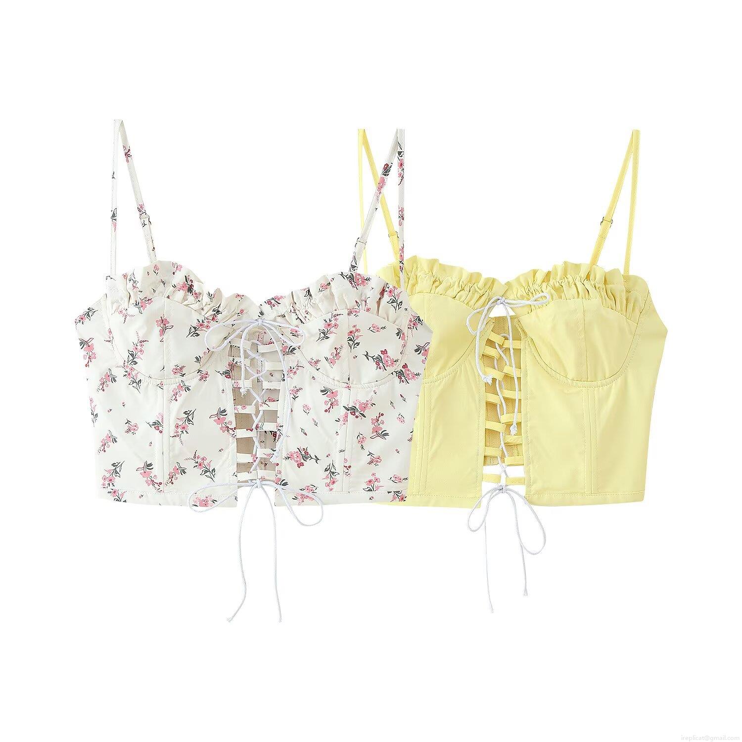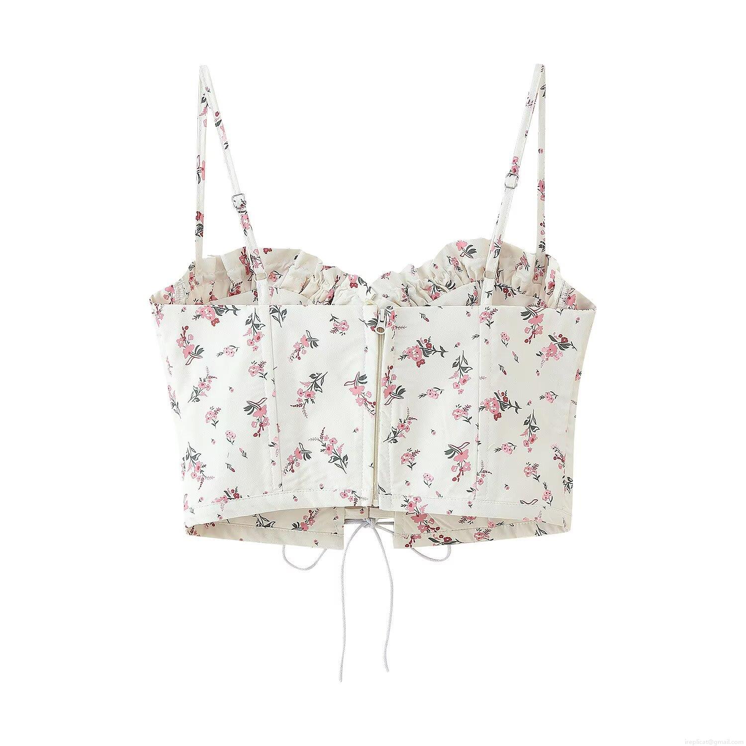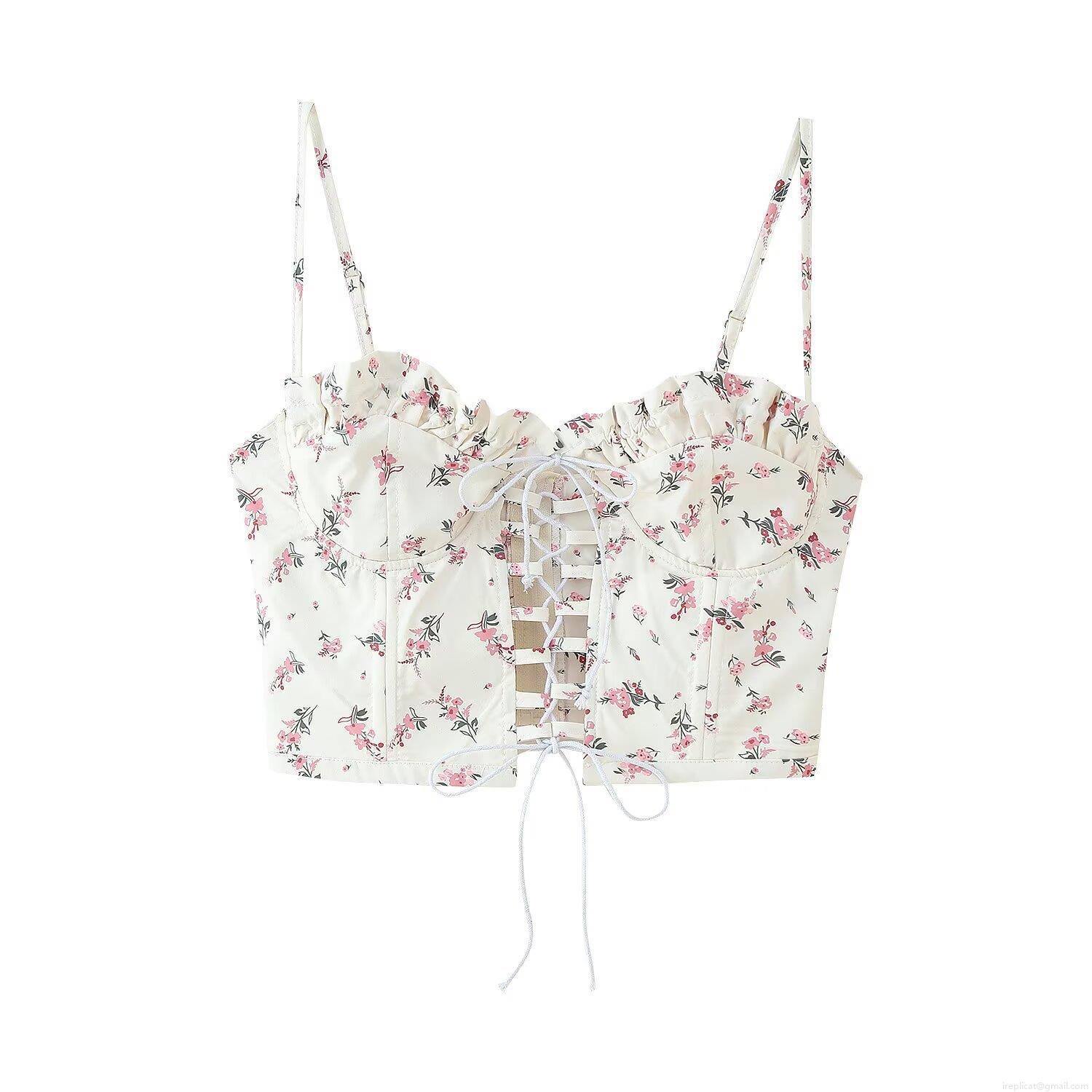 • Women's Floral Print Lace Up Corset Camisole Top Slim Fit Polyester Adjustable Straps Frill Trim Bustier Crop Tank Top For Women Vacation Summer Streetwear