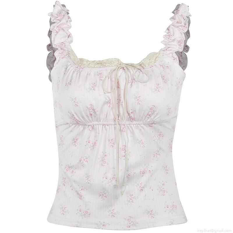 • Women's French Style Floral Print Camisole Top With Bow Lace Trim Ruffle Straps Slim Fit Ruched Summer Sleeveless Tank Top