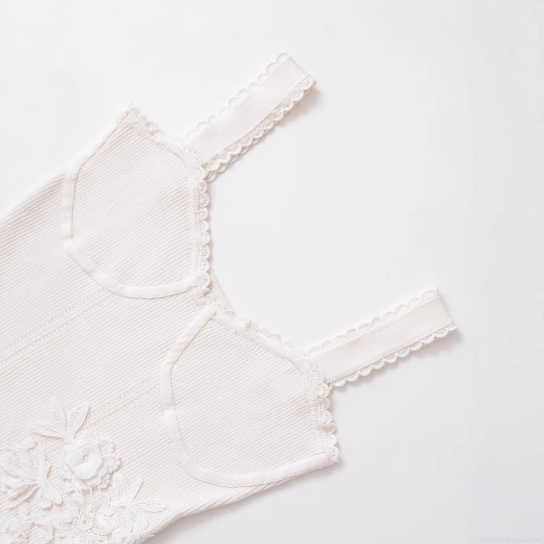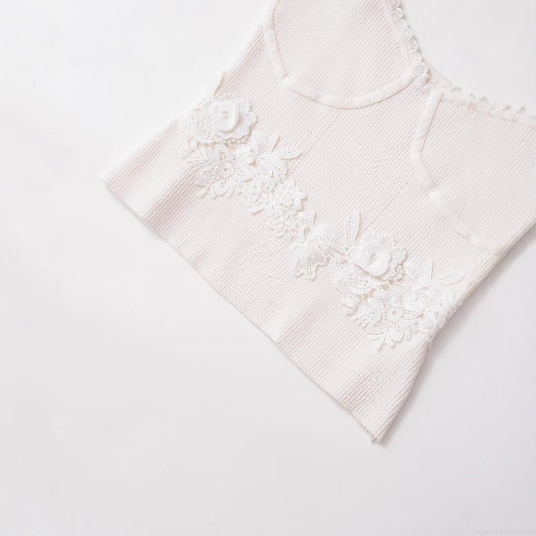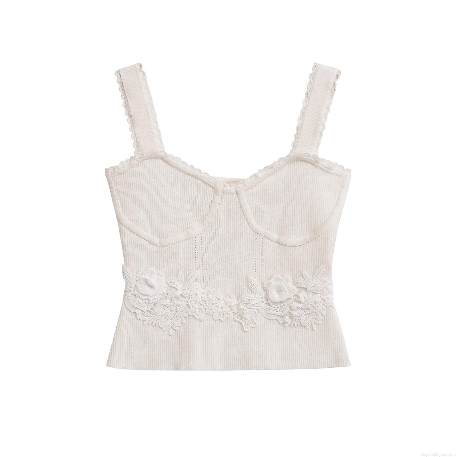 • Women's French Style Ribbed Knit Camisole With Lace Trim And Floral Applique Elegant Slim Fit Sleeveless Crop Top Summer Backless Tank Top Sexy White Vest For Party Daily Wear