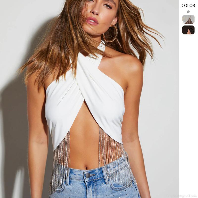 Women's Halter Cross Neck Crop Top With Metal Rhinestone Fringe Sexy Nightclub Party Backless Sleeveless Vest Western Style Beachwear Summer Fashion Top