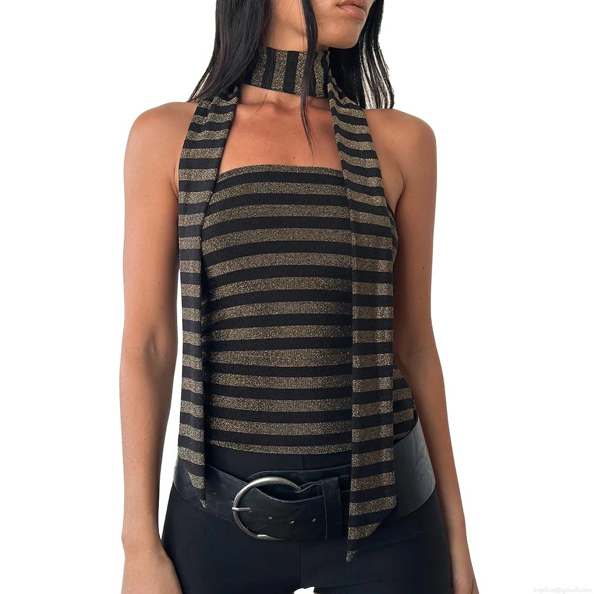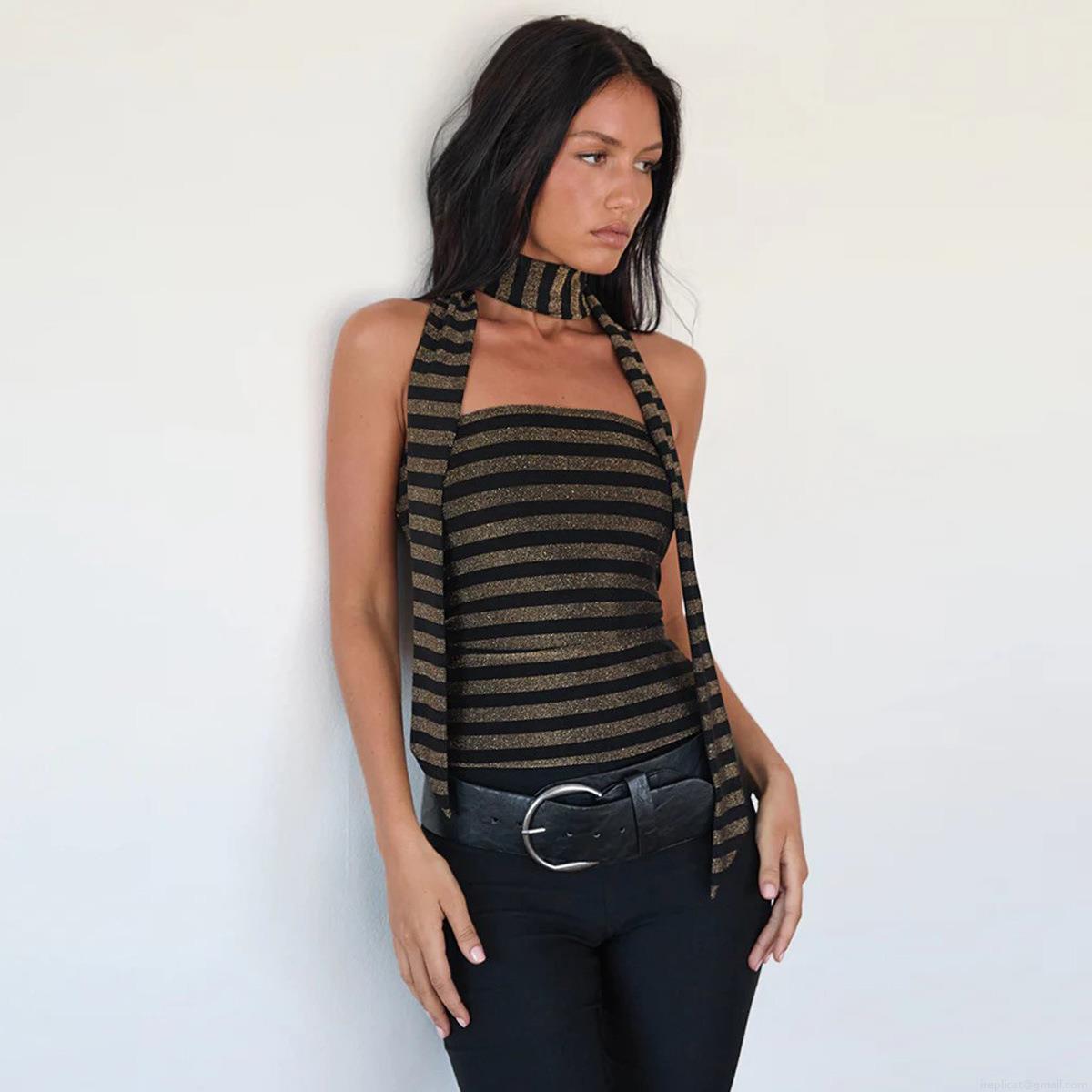 • Women's Halter Neck Crop Top Sexy Metallic Lurex Knitted Striped Tube Top With Scarf Backless Slim Fit Streetwear Party Clubwear Sleeveless Vest