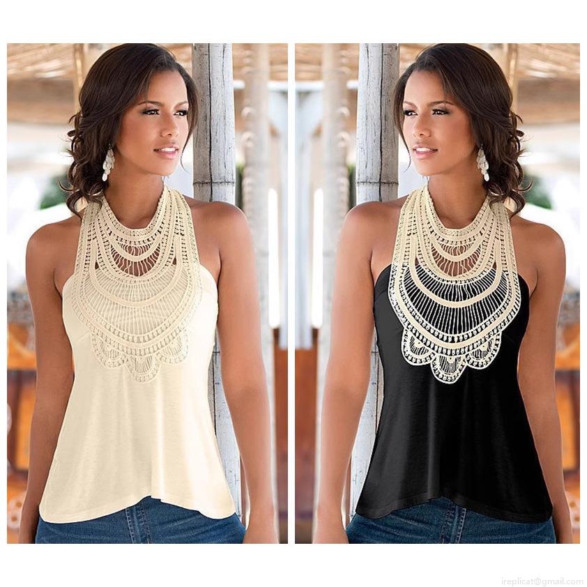 • Women's Halter Neck Sleeveless Crochet Lace Top Bohemian Chiffon Cotton Blend Hollow Out Backless Vacation Tank Top