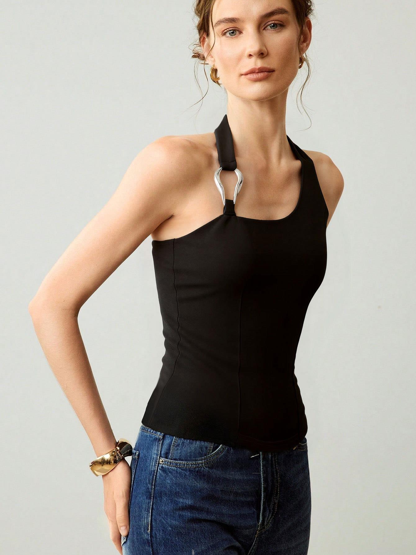 Women's Halter Neck Slim Fit Tank Top With Metal Ring Sexy Asymmetric One Shoulder Sports Yoga Crop Top Sleeveless Tops For Party Gym Activewear