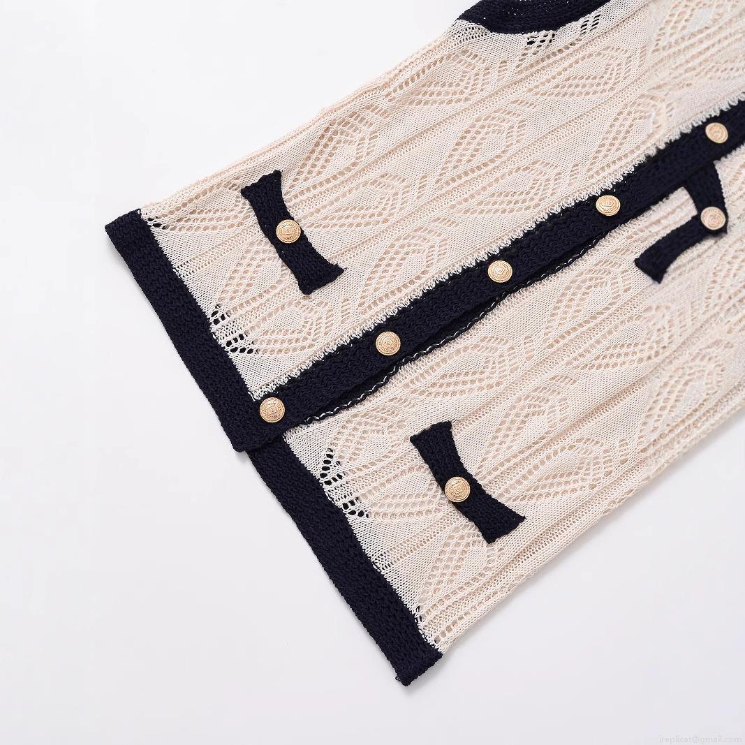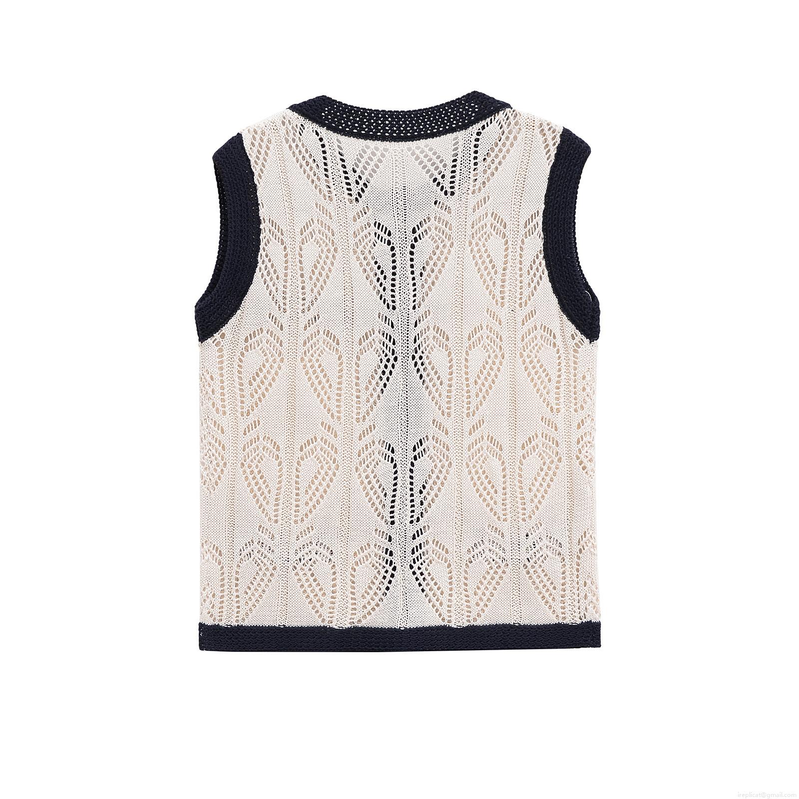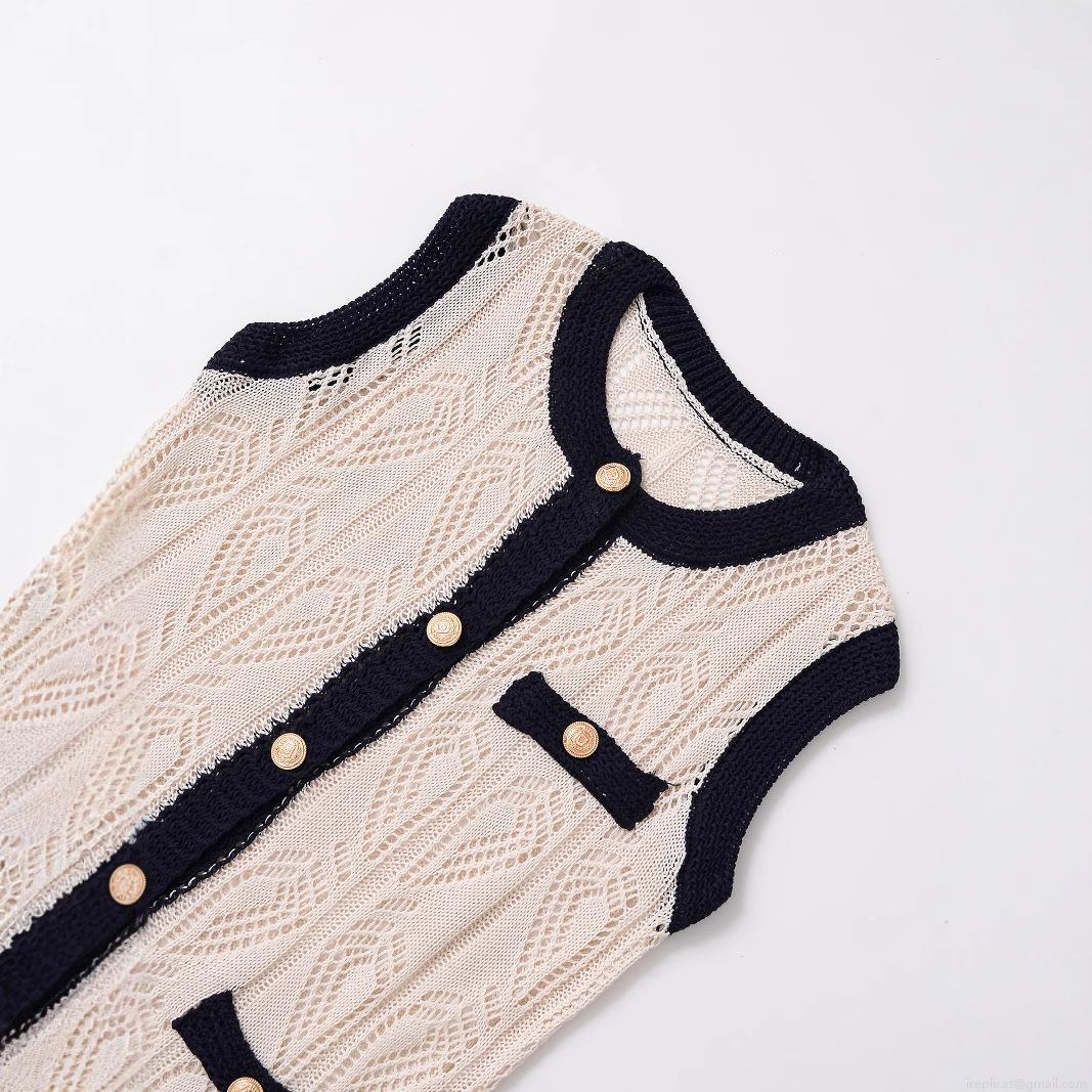 Women's Hollow Knit Vest Mercerized Cotton Contrast Trim Sleeveless Top With Gold Buttons Elegant Retro Chanel Style Slim Tank For Ladies