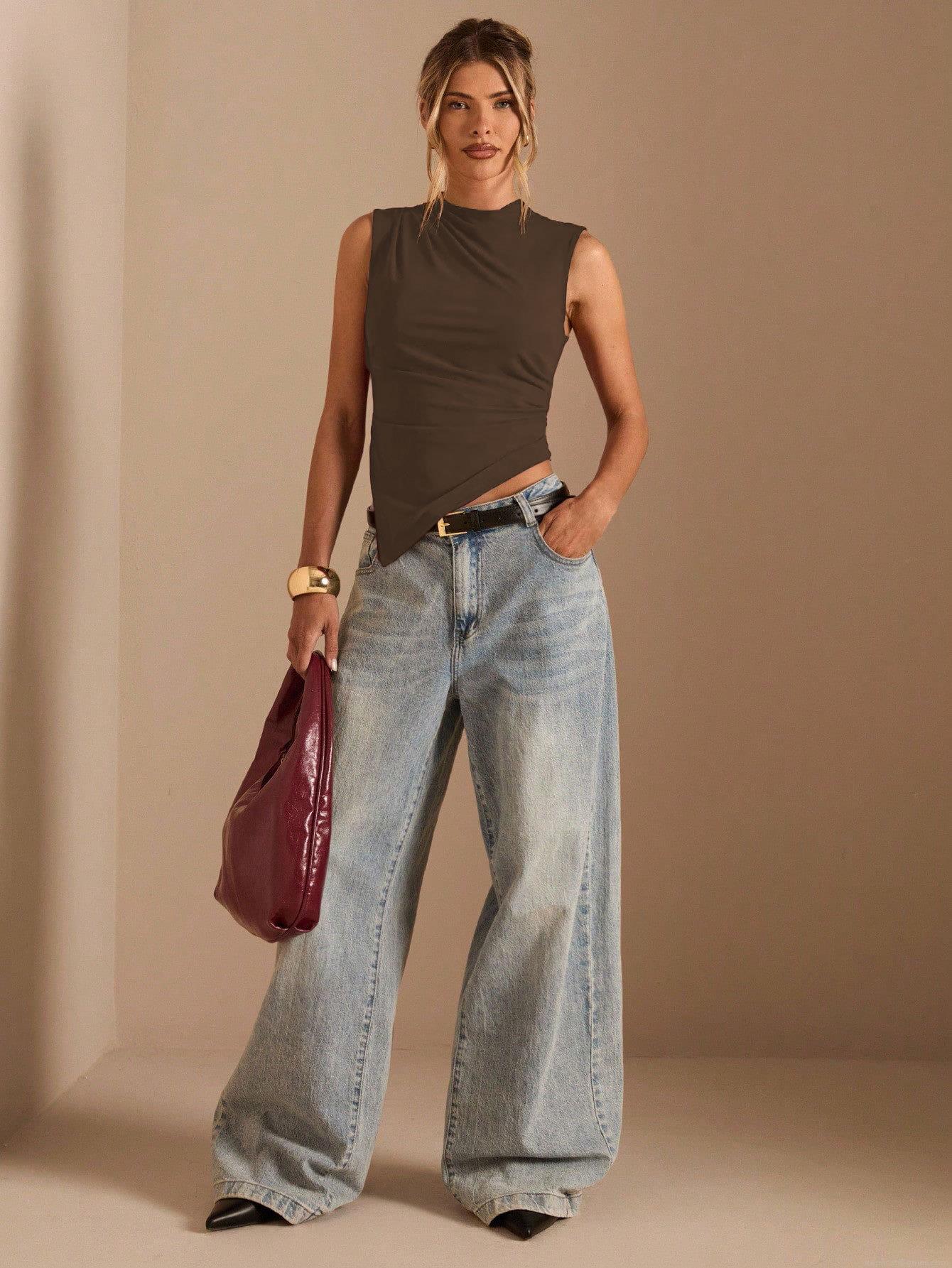 • Women's Irregular Hem Sleeveless Knit Tank Top Slim Fit Mock Neck Brown Summer Casual Vest For Ladies Breathable Streetwear Polyester Elastane Blend
