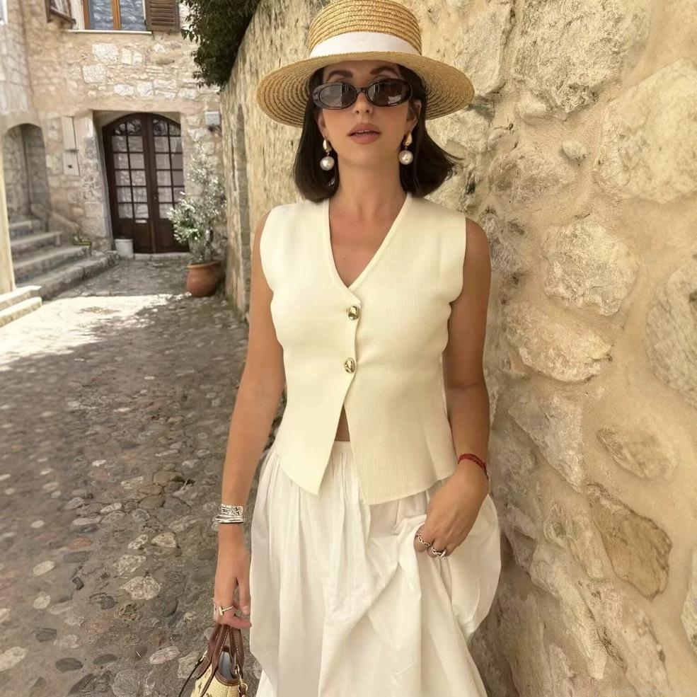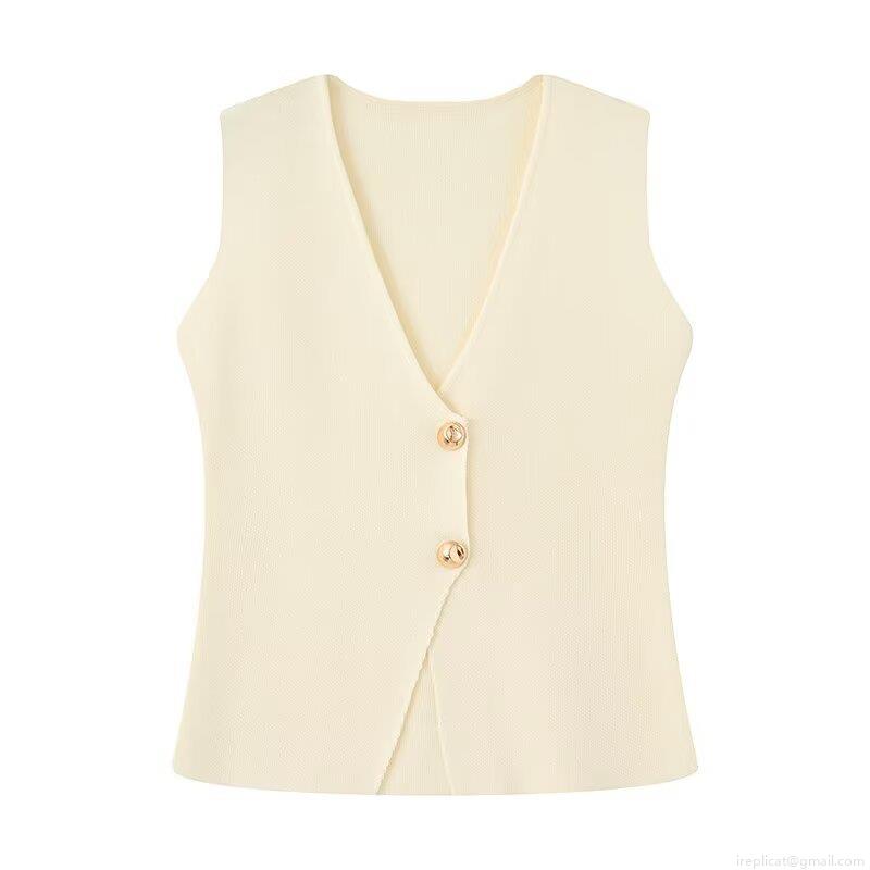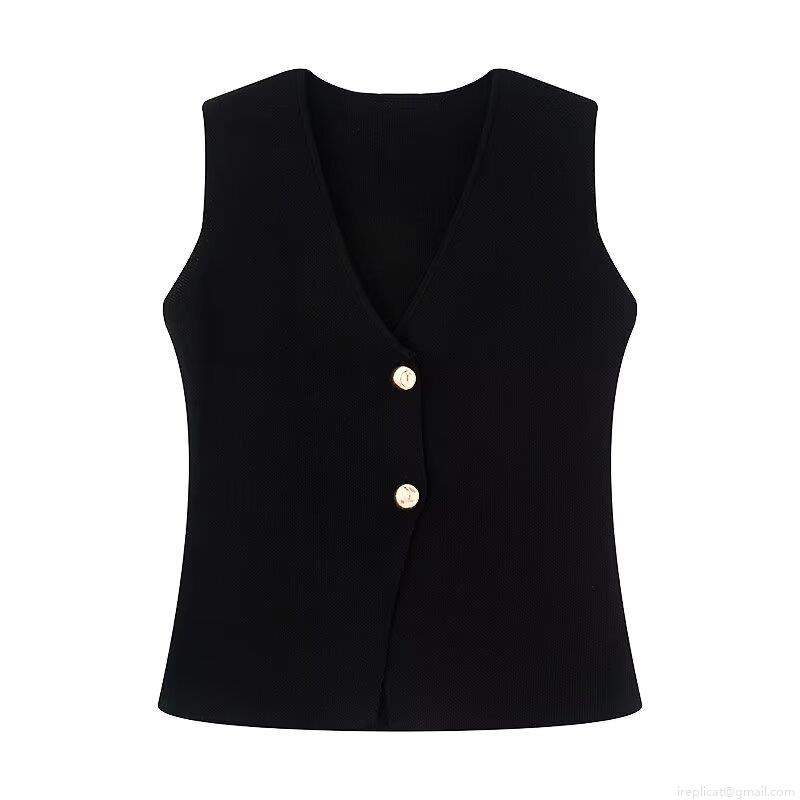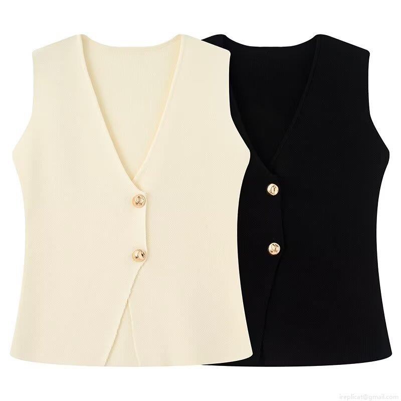 Women's Knit Vest V-Neck Sleeveless Waistcoat With Gold Buttons Slim Fit Polyester Cropped Tank Top For Vacation Daily Chic Streetwear