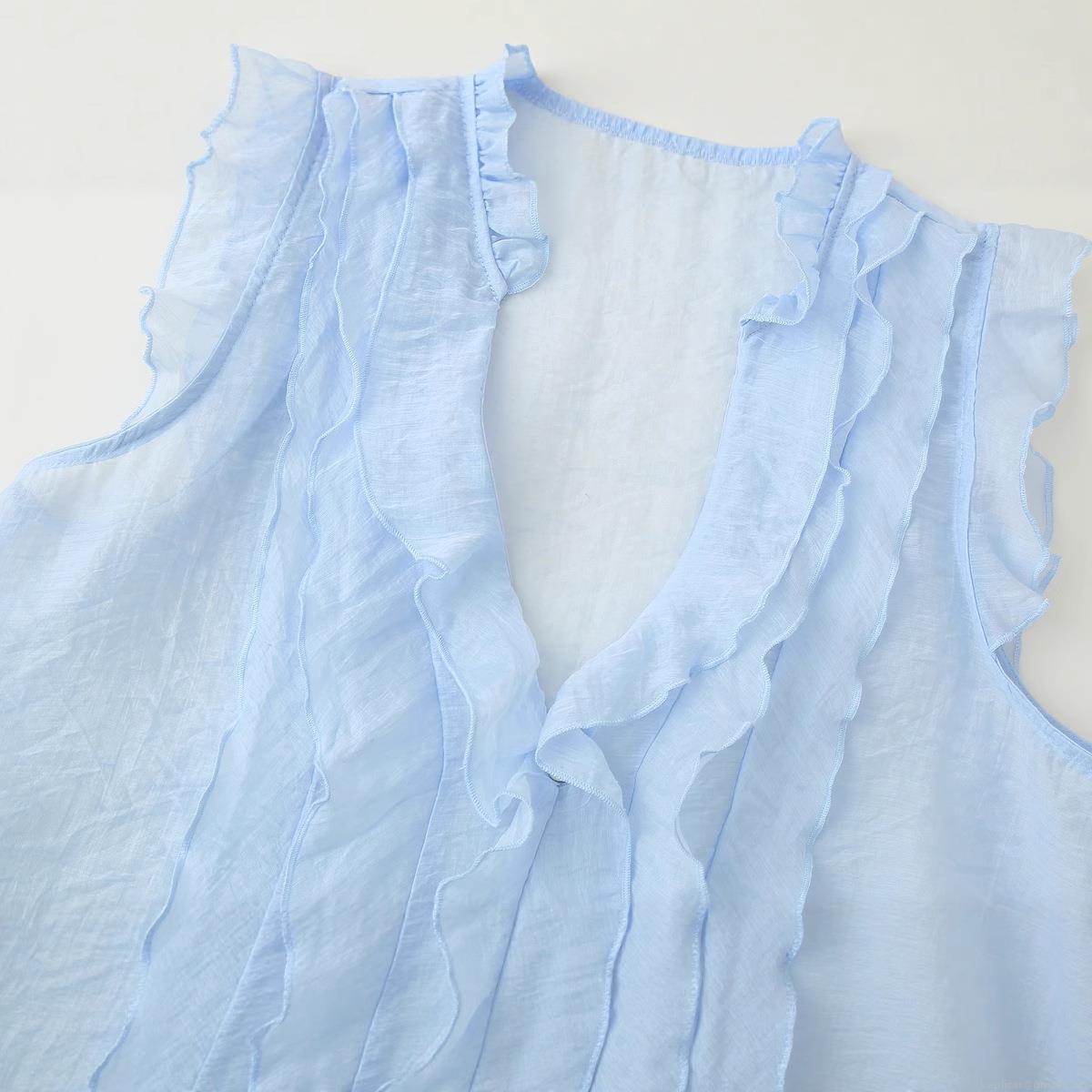 • Women's Light Blue Sleeveless Chiffon Top With Ruffle Trim Detail V-Neck Button Down Pleated Slim Fit Tank Top For Summer Dating Elegant Sweet Style