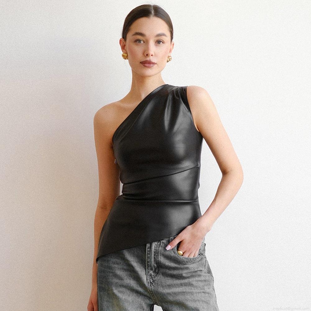 Women's One Shoulder Faux Leather Vest Sleeveless Slim Fit Irregular Hem PU Tank Top Sexy Streetwear Solid Color Clubwear Blouse