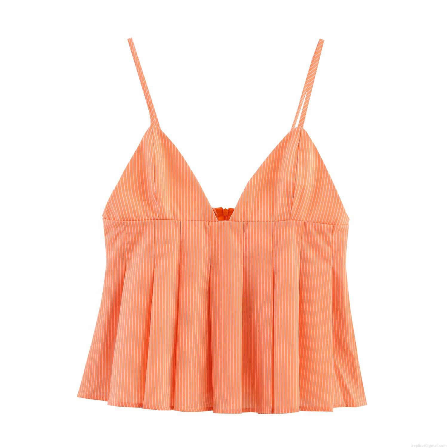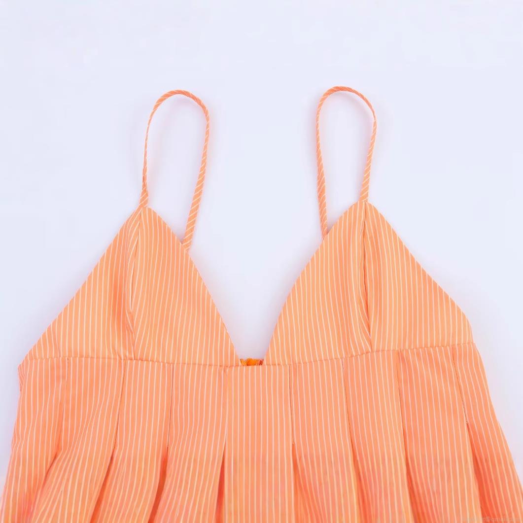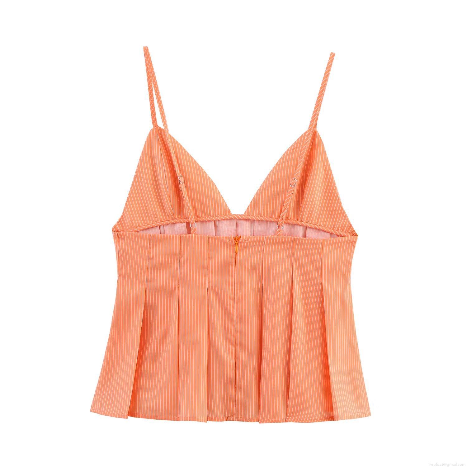 • Women's Poplin Orange White Striped Cami Top Sexy V-Neck Adjustable Spaghetti Straps Pleated Peplum Hem Back Zipper Sleeveless Summer Blouse