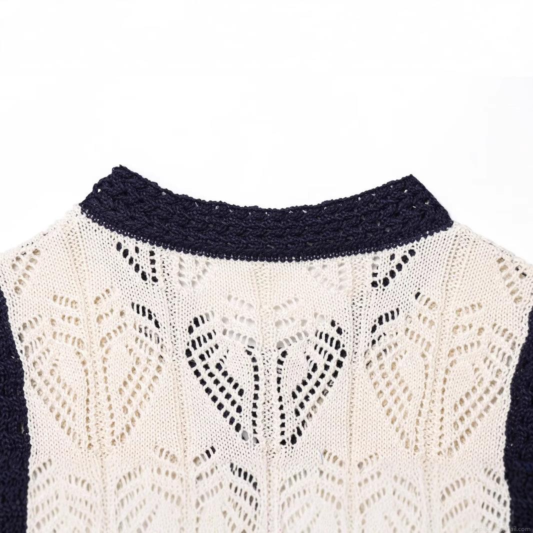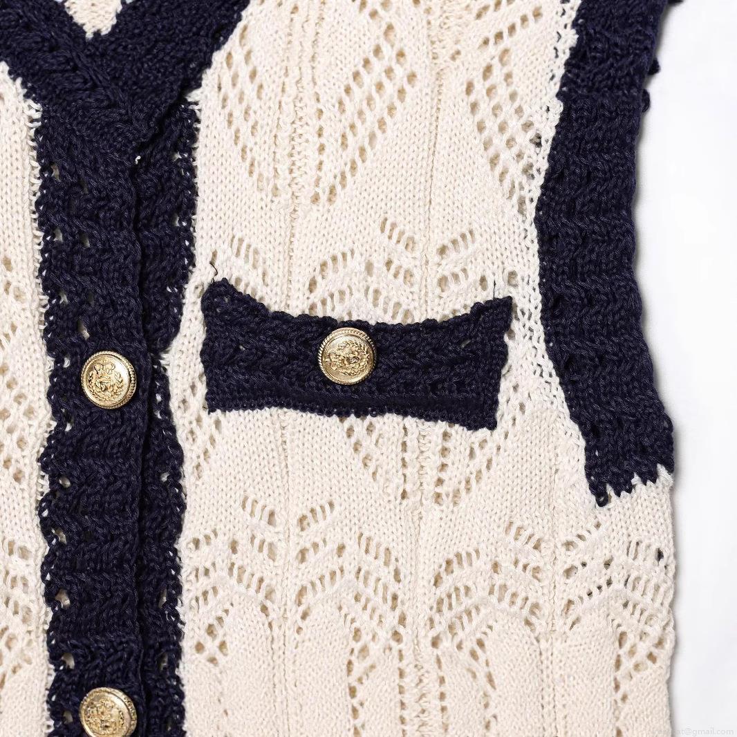 • Women's Retro French Style Heart Hollow Out Knit Vest Elegant Contrast Trim Button Down Tank Top Sleeveless Round Neck Polyester Knitwear for Daily Streetwear