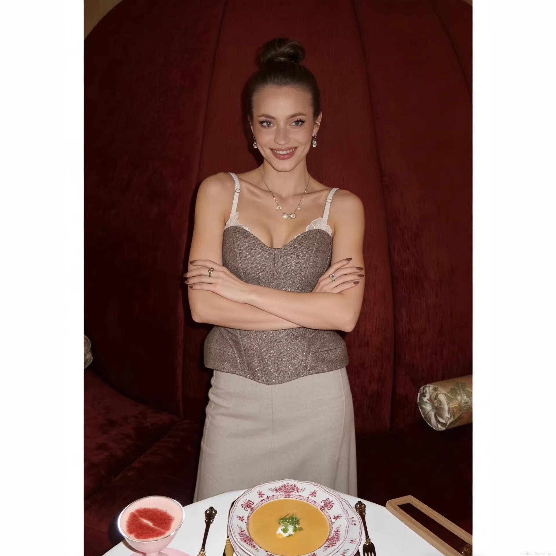 Solid Color, Glossy Silk, Waist Corset, Woven Texture, Fishbone Support, White Lace Patchwork