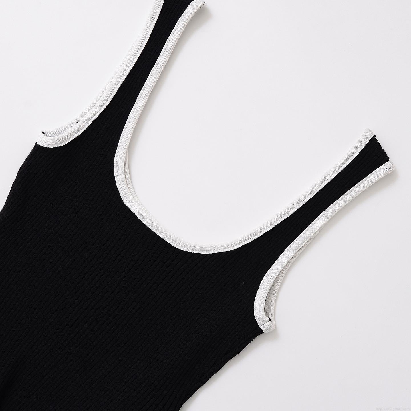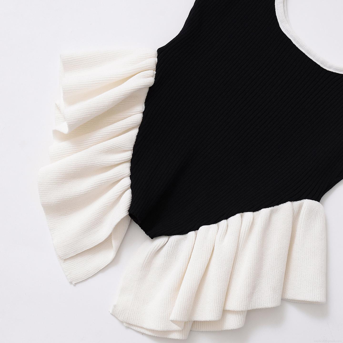 • Women's Ribbed Knit Camisole Tank Top Contrast Black White Patchwork Ruffle Trim U-Neck Slim Fit Sexy Streetwear Sleeveless Bodysuit Top