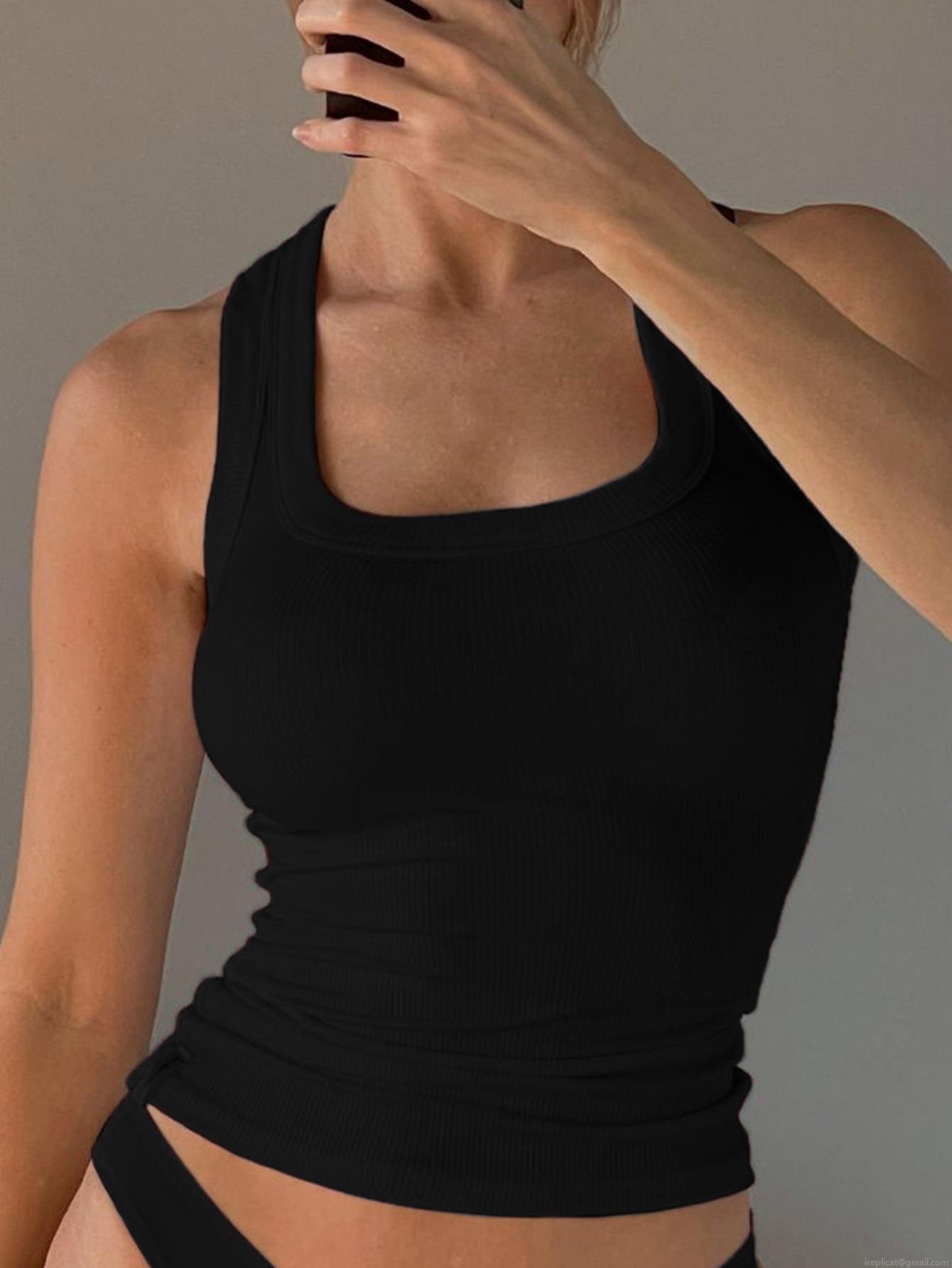 Solid Color, Square Collar, Ribbed Knit, Thread Texture, U-neck, 工字背