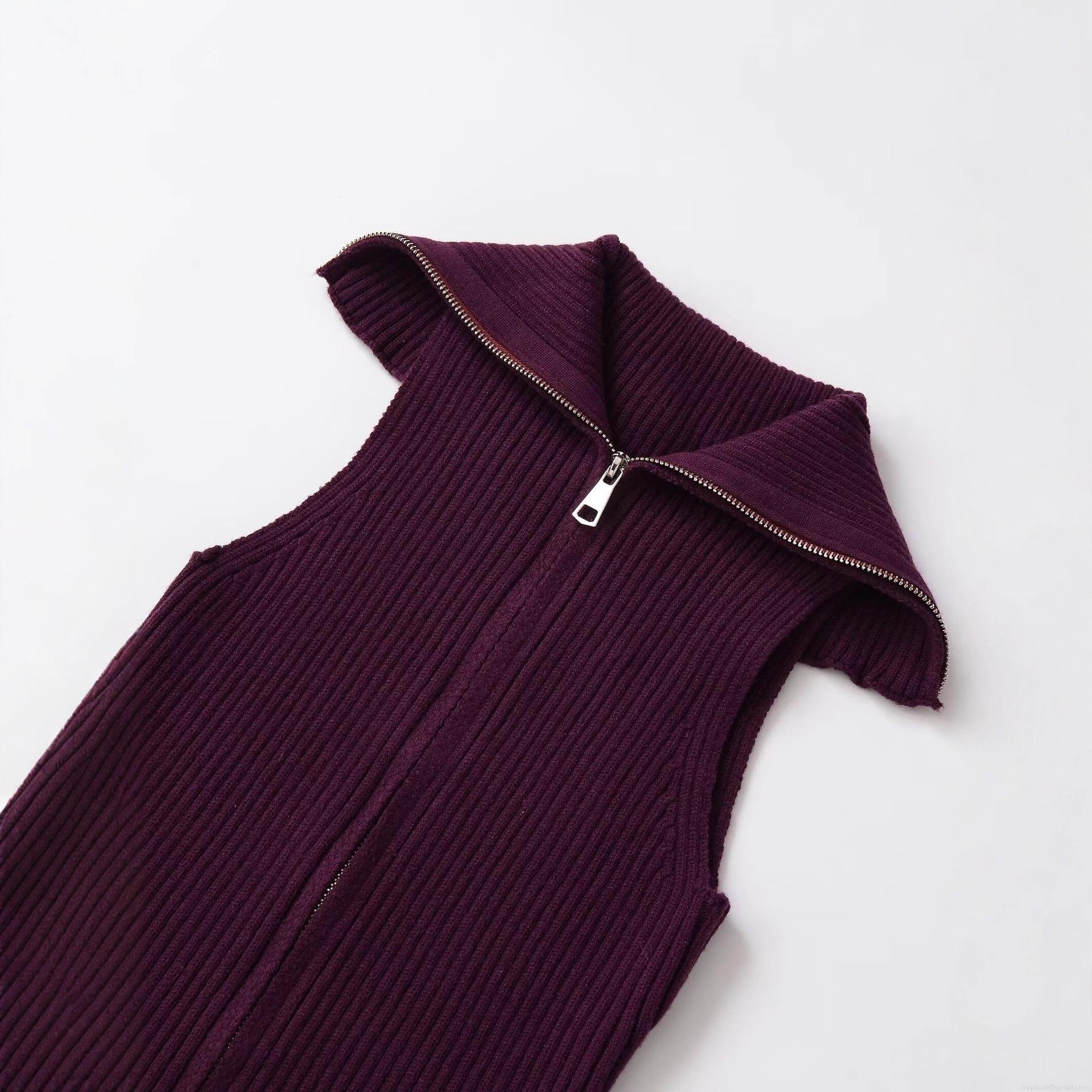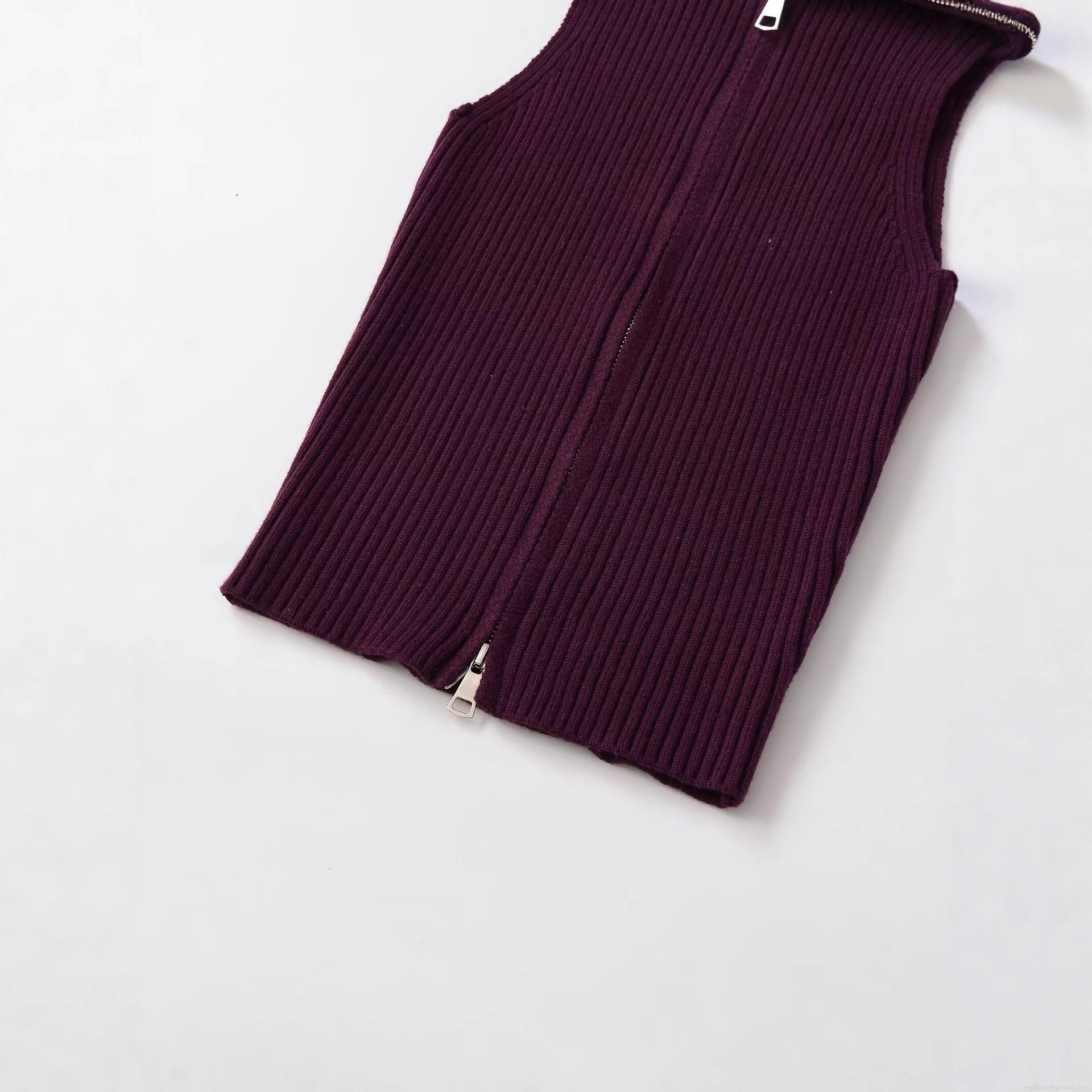 • Women's Ribbed Knit Zip-up Tank Top Sleeveless Lapel Collar Crop Vest Solid Wine Red Polyester Sweater Vest for Women Daily Casual Slim Fit Top