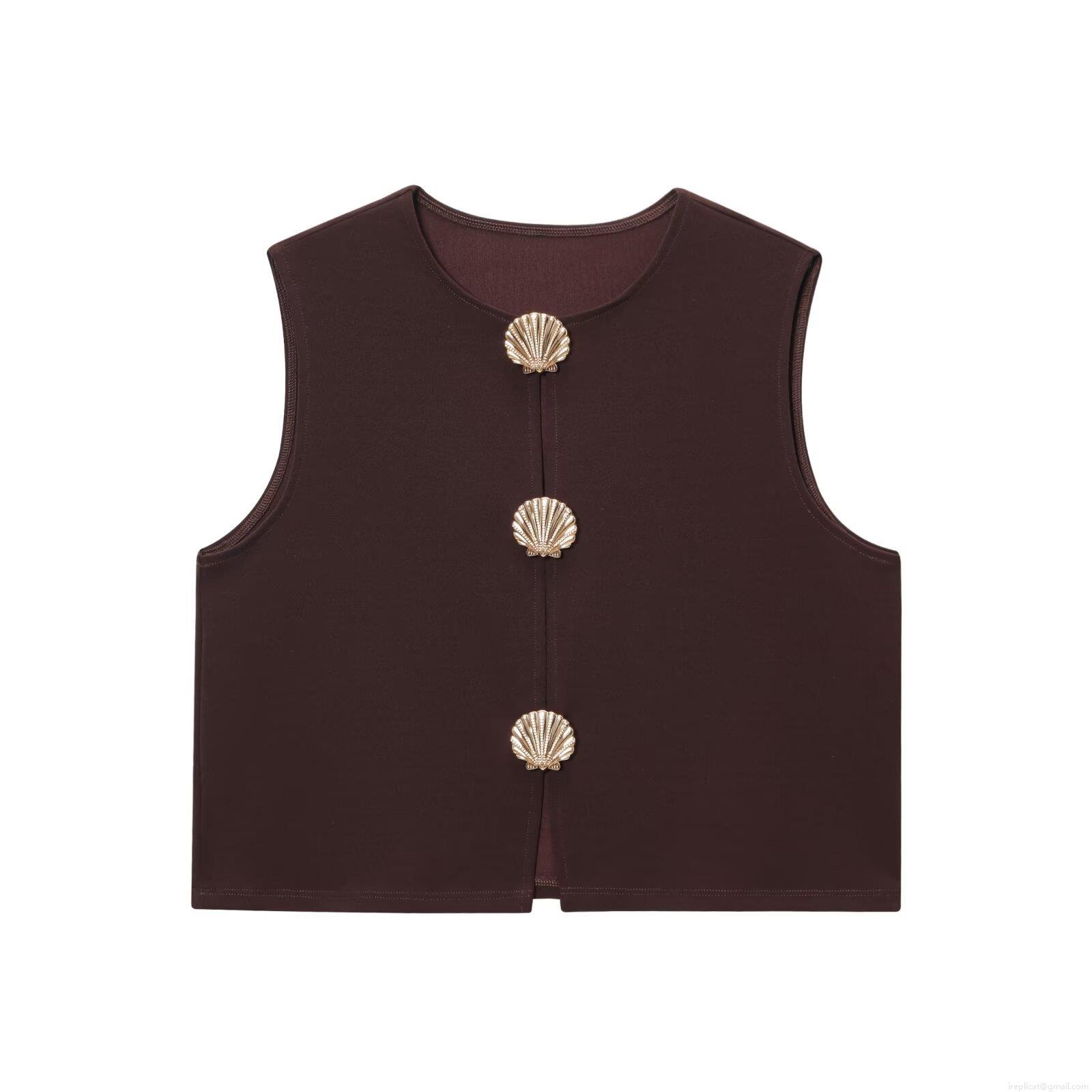 Women's Round Neck Sleeveless Vest Top With Gold Shell Buttons European American Style Casual Short Single Breasted Waistcoat Streetwear Solid Color Fashion Outerwear