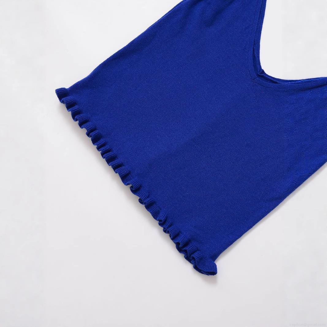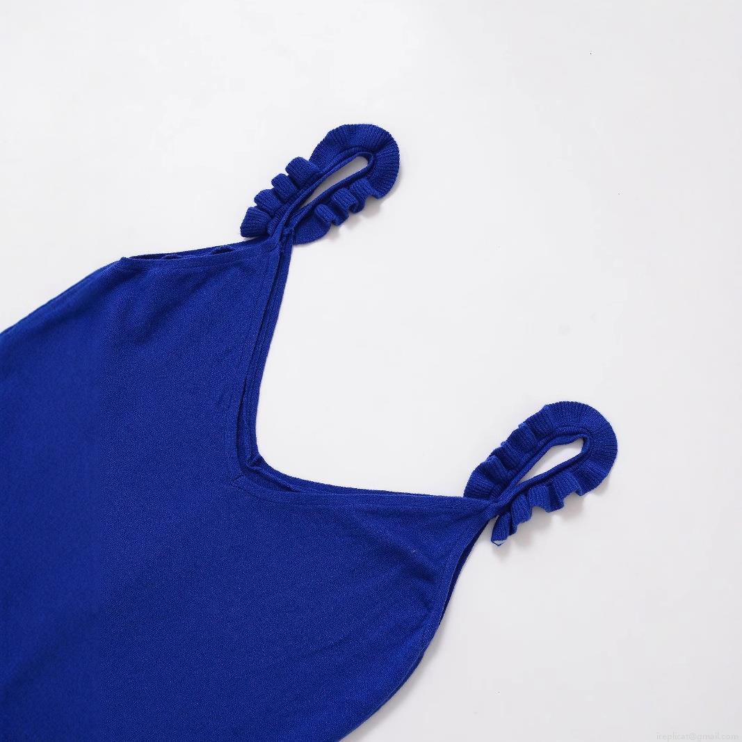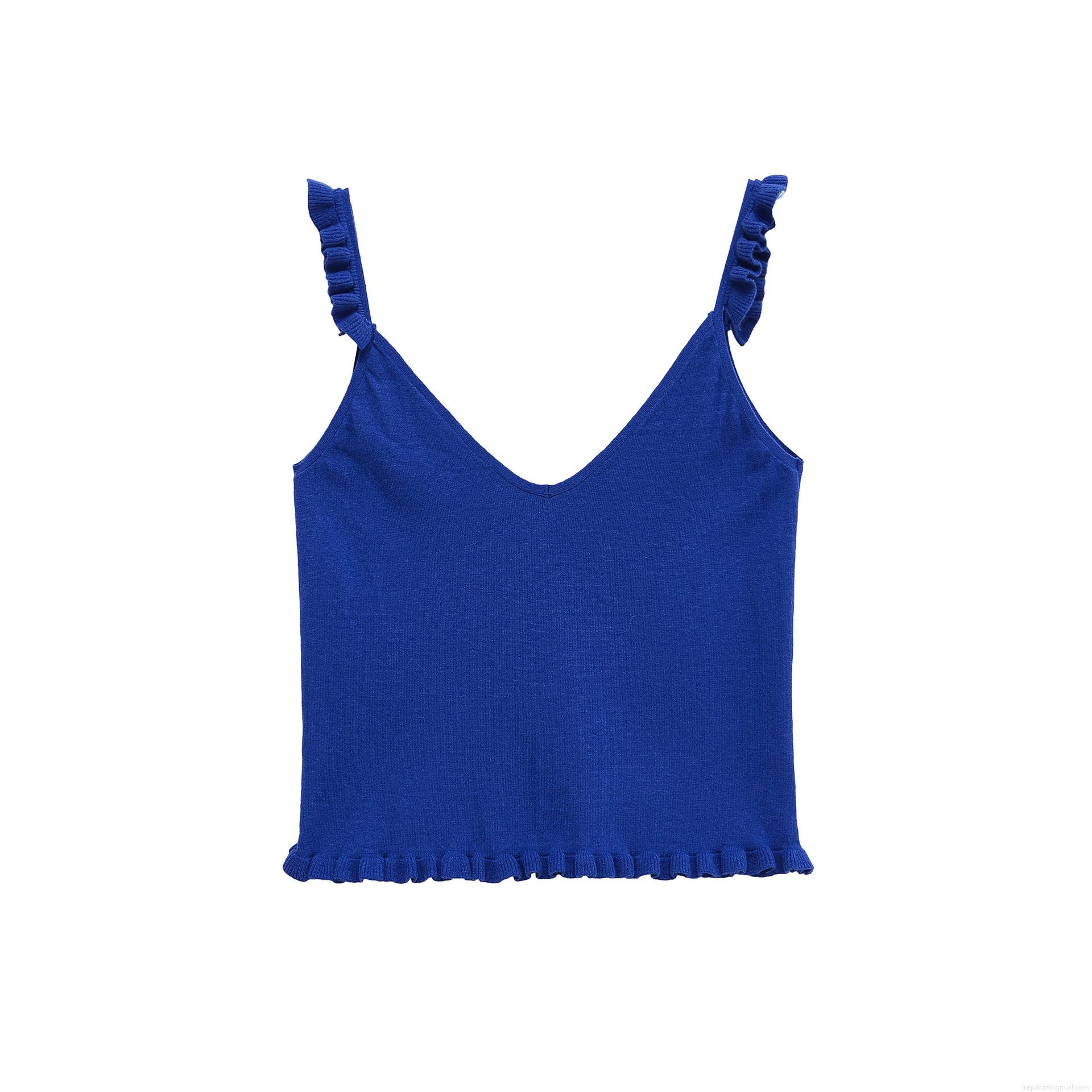 • Women's Royal Blue V-Neck Knitted Camisole Top With Ruffle Shoulder Straps And Lettuce Trim Hem Slim Fit Sleeveless Polyester Knit Tank Top For Summer Daily Vacation