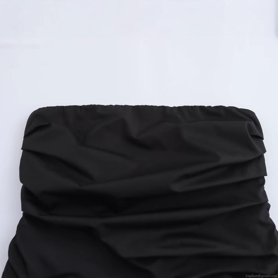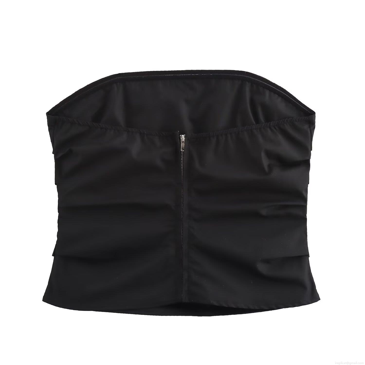 • Women's Ruched Bandeau Top Sexy Strapless Polyester Slim Fit Crop Top With Front Zipper Solid Black Streetwear Summer Fashion