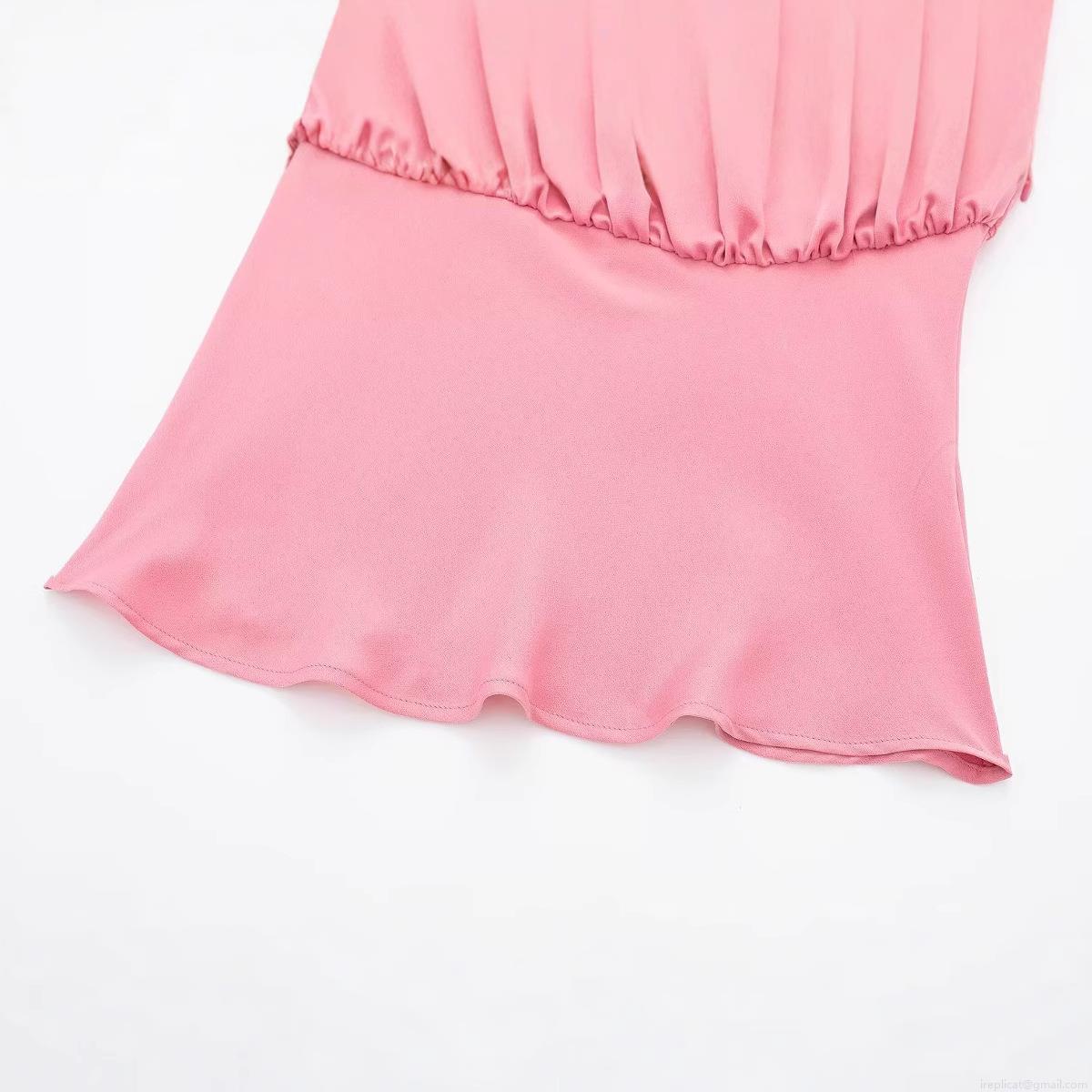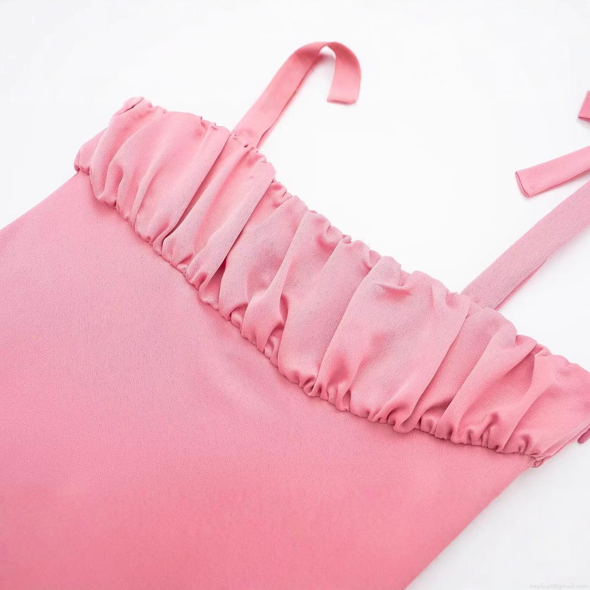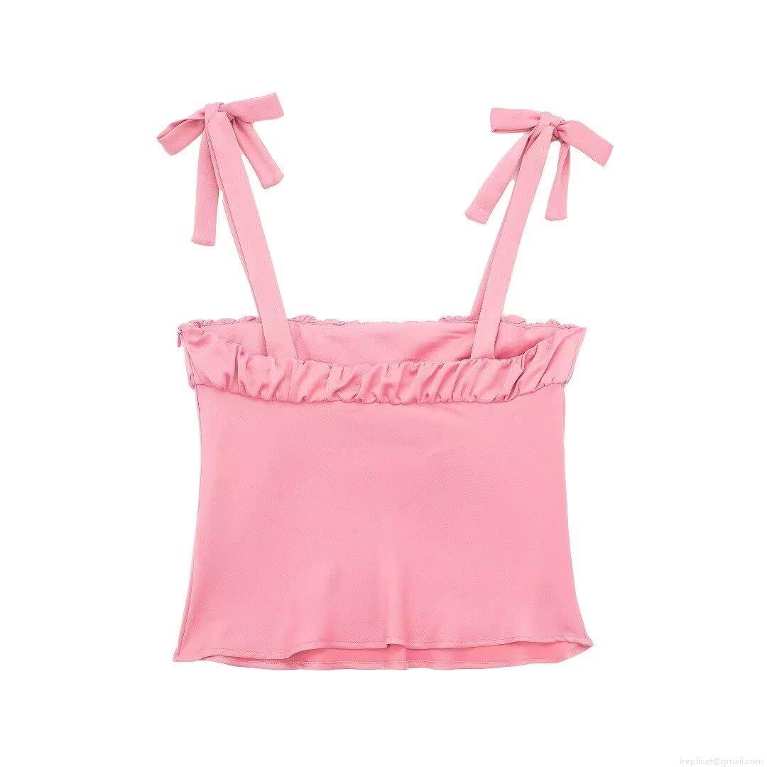 Women's Satin Camisole Sexy Bow Tie Shoulder Straps Pleated Slim Fit Crop Tank Top Sleeveless Peach Pink Summer Street Style