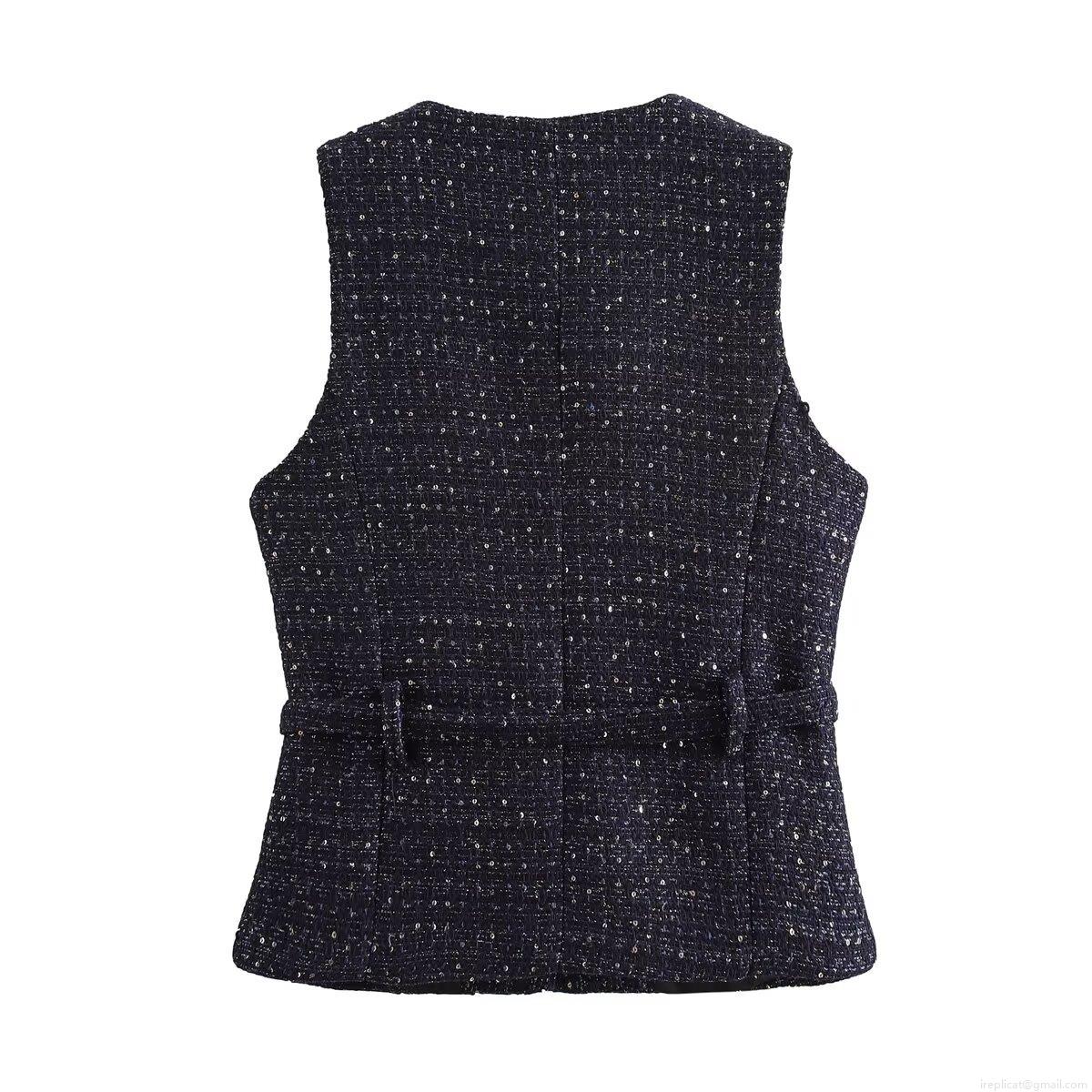 Women's Sequin Tweed Vest Sleeveless Waist Belt Jacket Round Neck Gold Flower Button Tank Top For Party Streetwear Ladies Autumn Outerwear