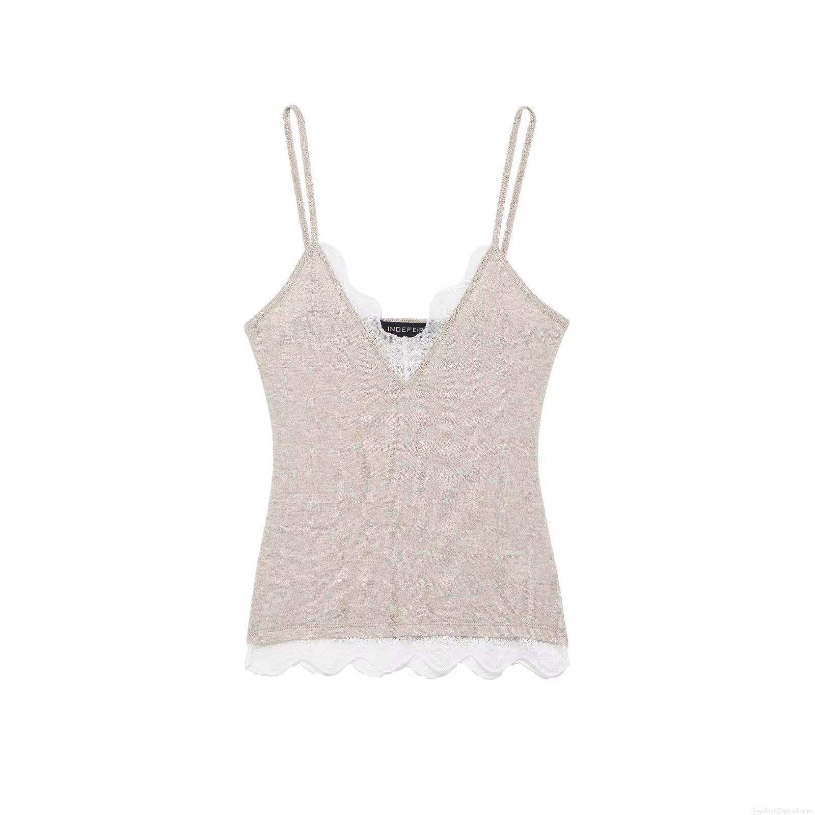Solid Color, Splice, Lace Trim, V-neck, Ribbed Knit, Thin Shoulder Straps