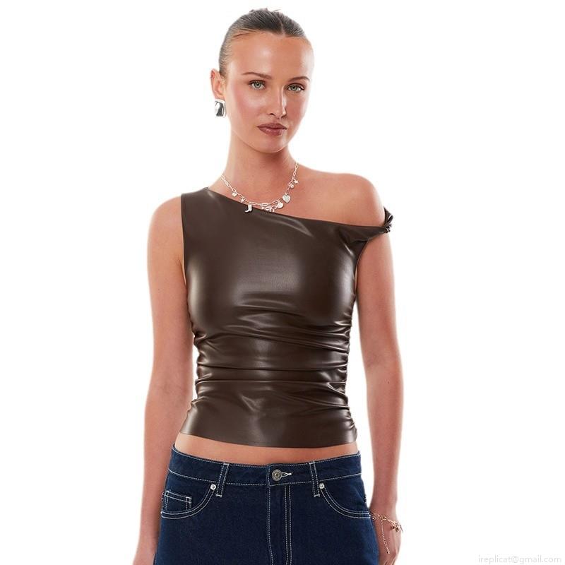 • Women's Sexy Asymmetric One Shoulder PU Leather Tank Top Ruched Slim Fit Sleeveless Solid Color Streetwear Fashion Vest Top for Women