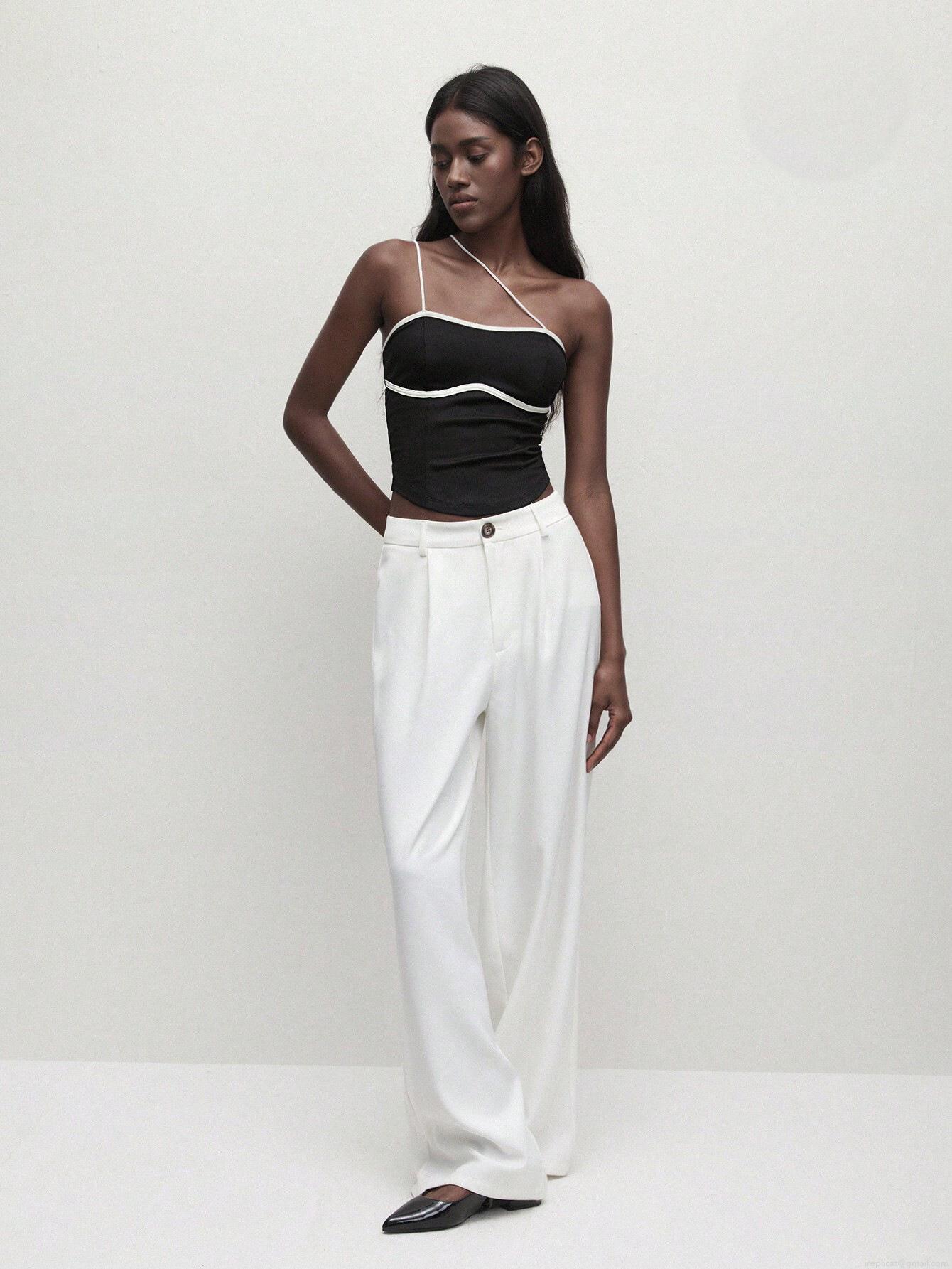 • Women's Sexy Asymmetric Strap Camisole Contrast Piping Backless Ribbed Knit Slim Fit Tank Top Summer Clubwear Sleeveless Vest