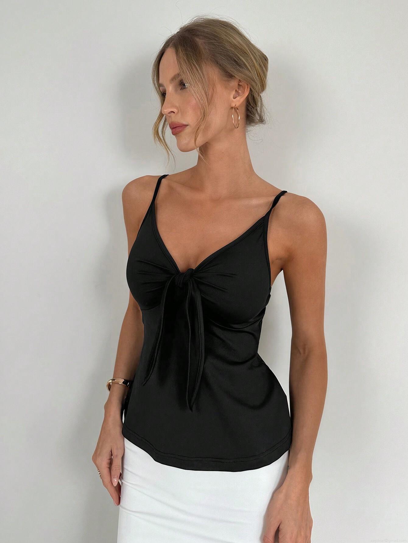 • Women's Sexy Black Camisole Tank Top 95% Polyester 5% Elastane Slim Fit Bow Tie Front V Neck Sleeveless Top for Summer Daily Party Clubwear