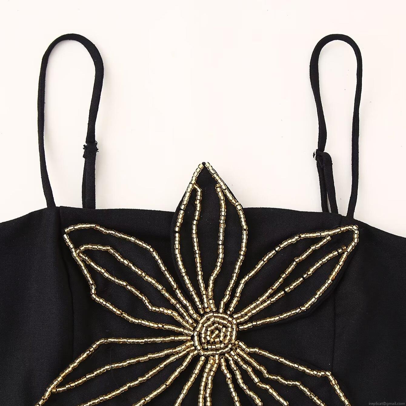 • Women's Sexy Black Single Strap Camisole Top Polyester Fabric Large Gold Beaded Flower Decoration Summer Party Club Hot Girl Crop Top