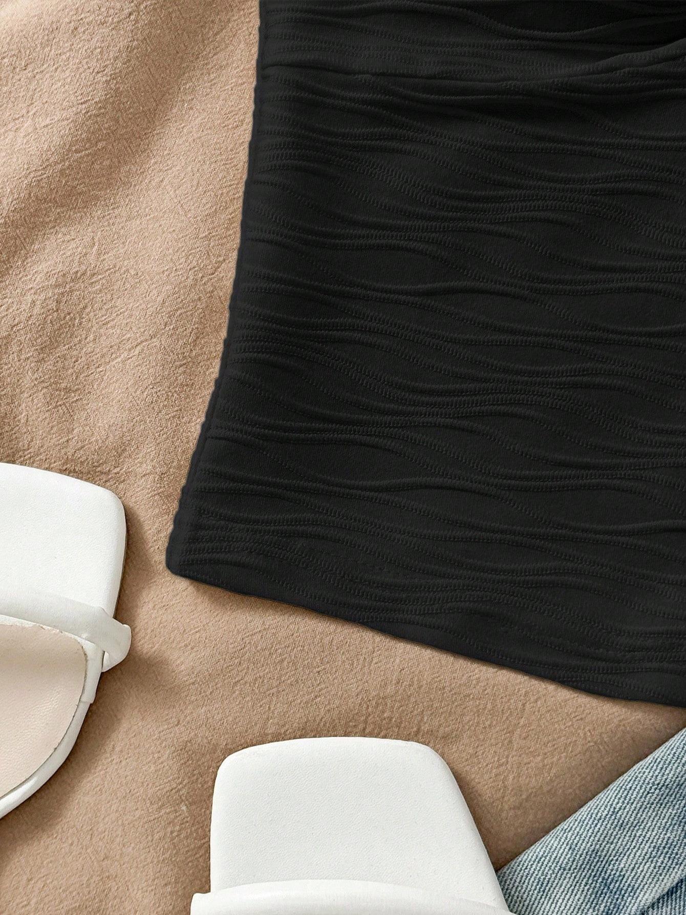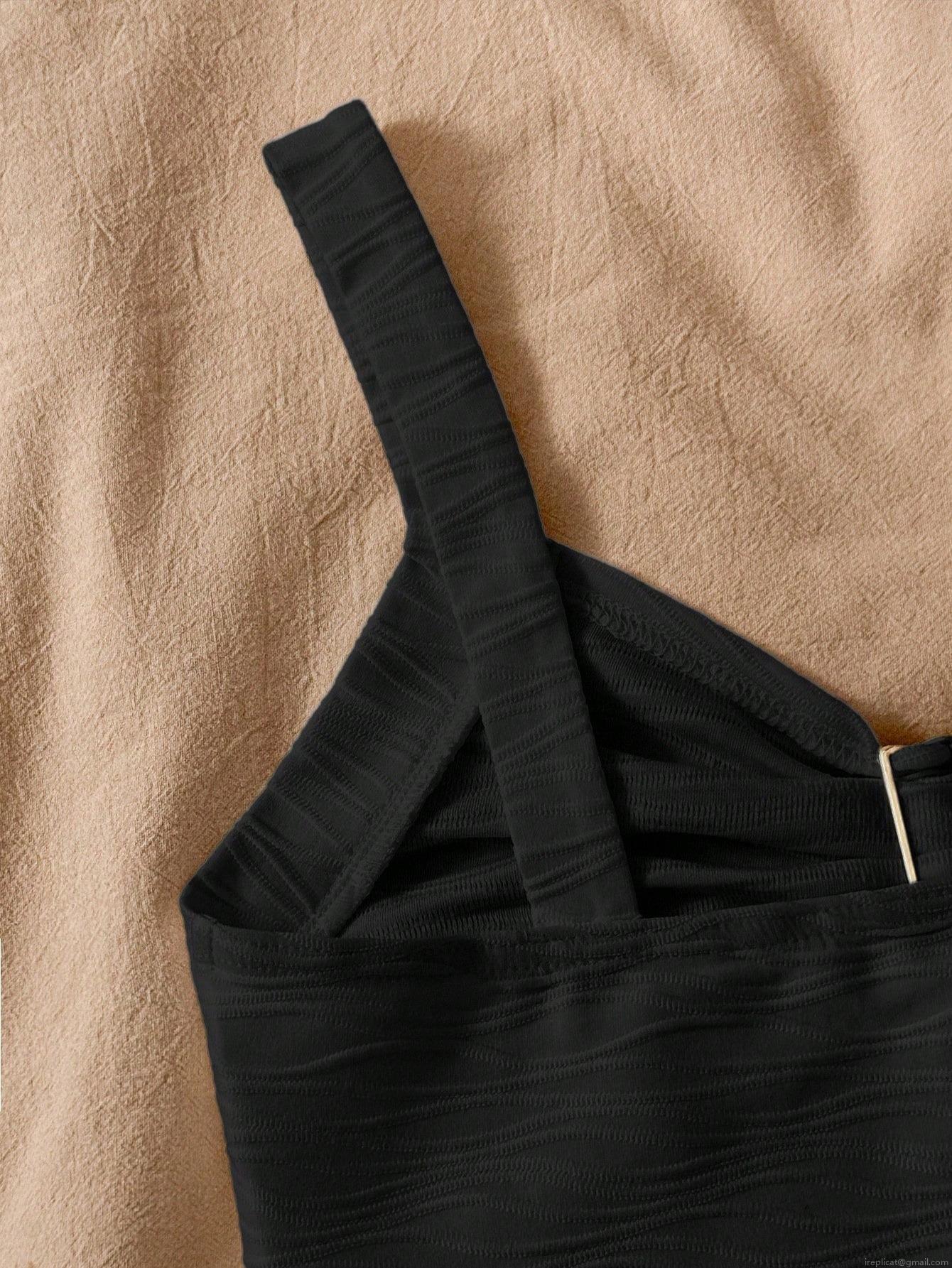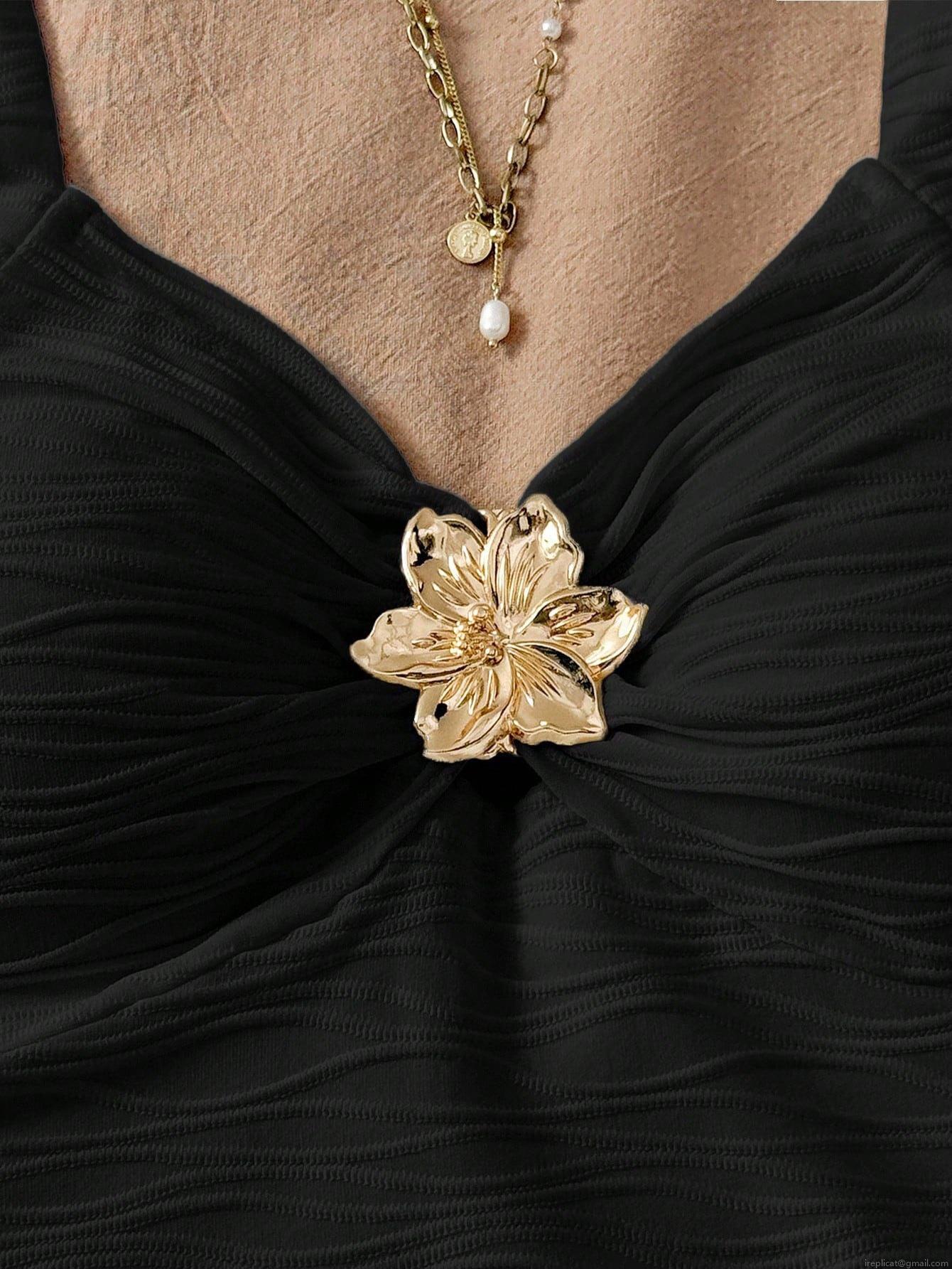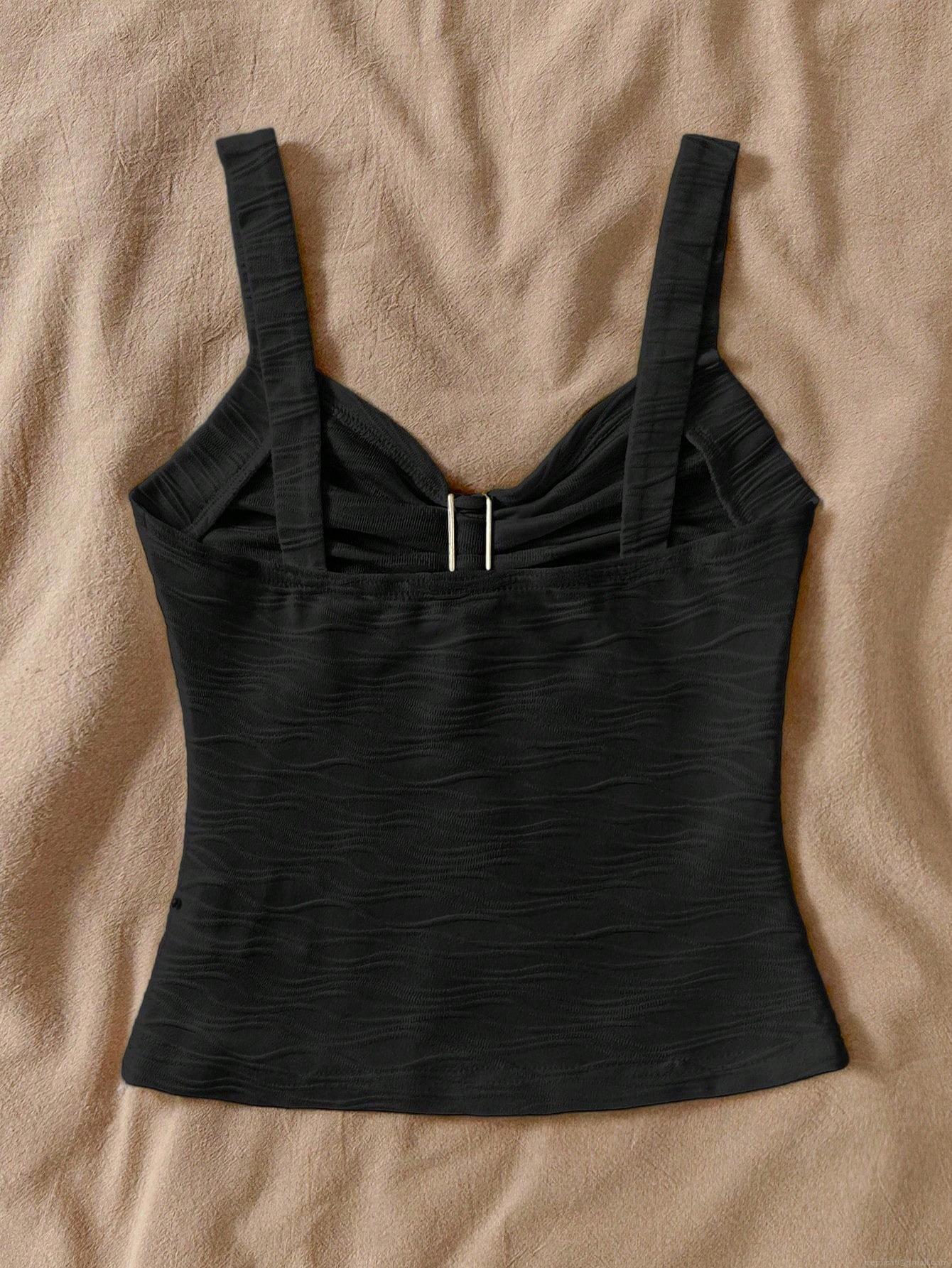 • Women's Sexy Black Slim Fit Camisole Vest With Metal Flower Decor Wavy Texture V Neck Sleeveless Tank Top For Summer Vacation Beach Party