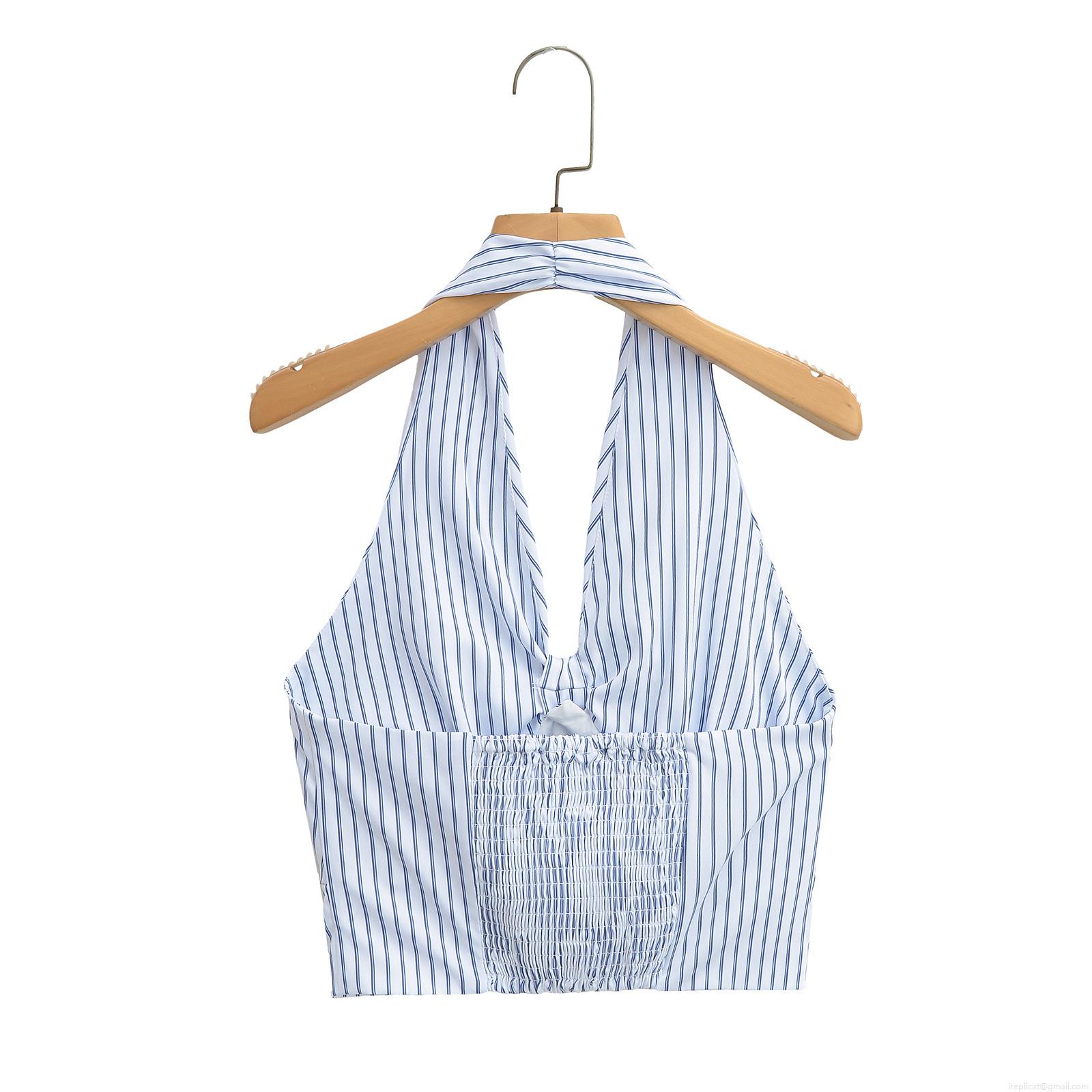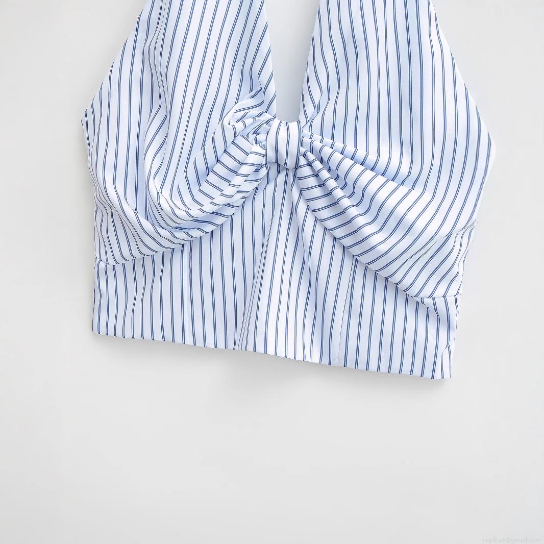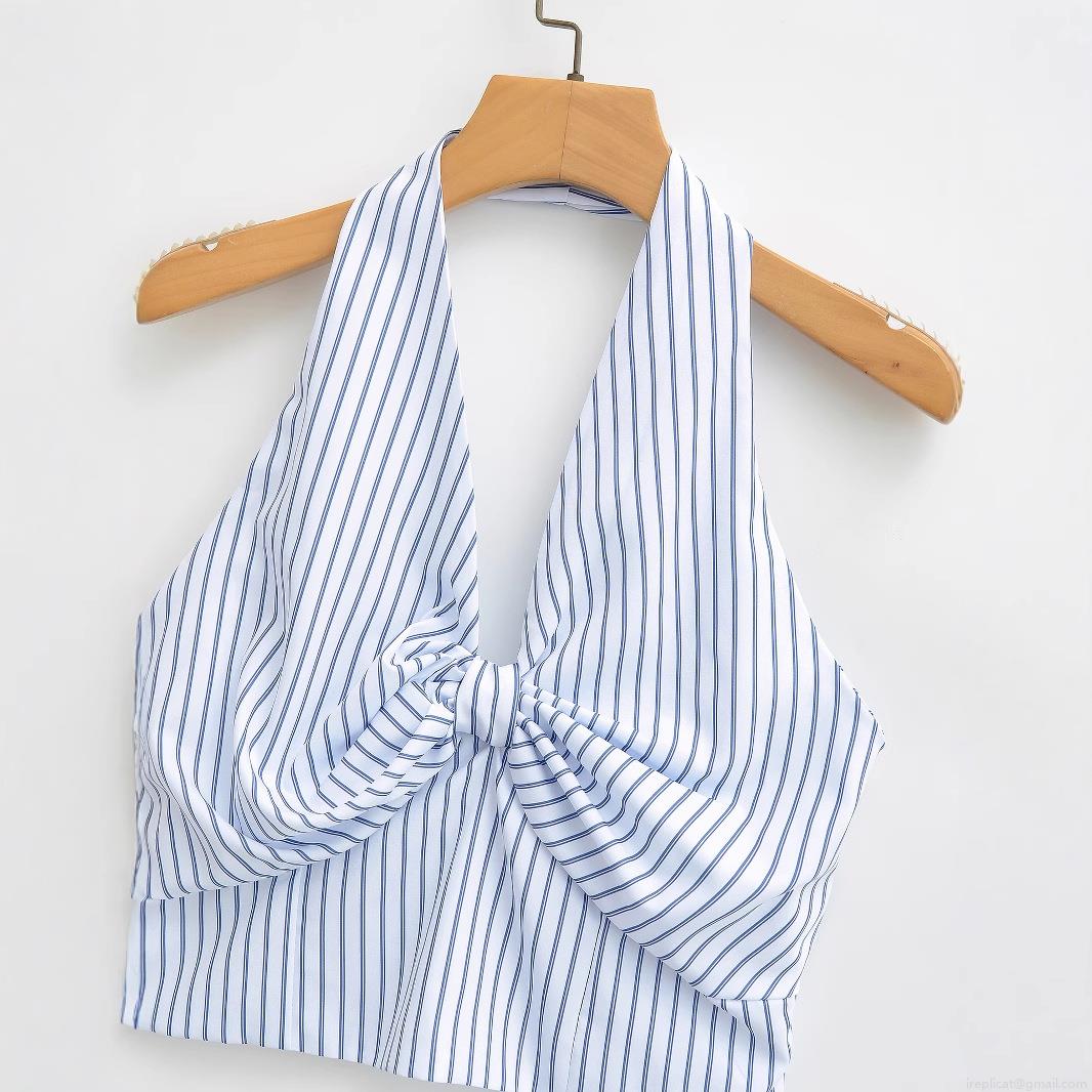 • Women's Sexy Blue and White Striped Halter Neck Tank Top With Front Bow Knot Detail Smocked Back Cropped Sleeveless Summer Cami Top For Women