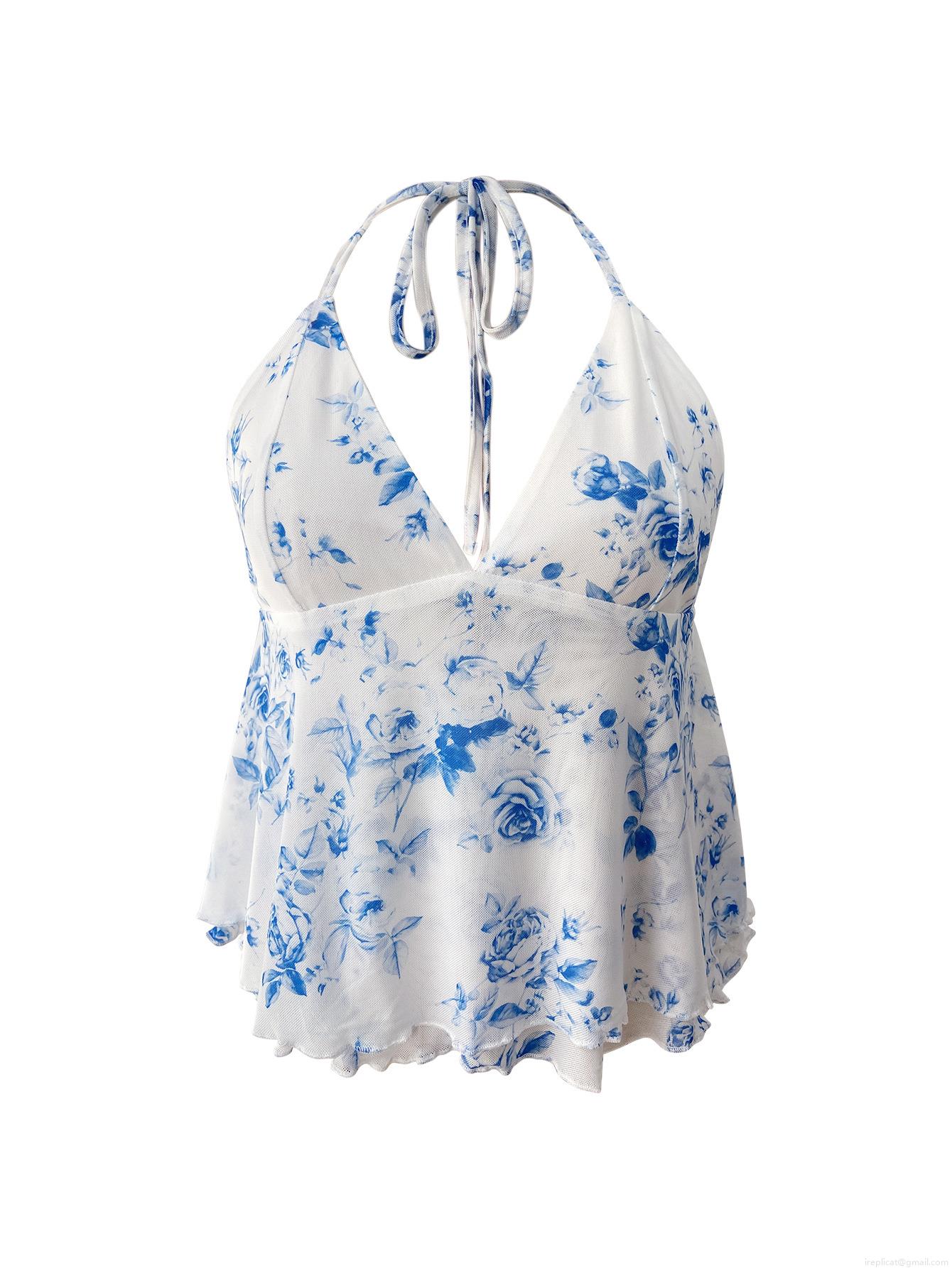 • Women's Sexy Deep V Neck Halter Neck Crop Top Blue And White Floral Print Backless Ruffled Hem Tank Top For Summer Beach Vacation Casual Wear Polyester Spandex Sleeveless Camisole