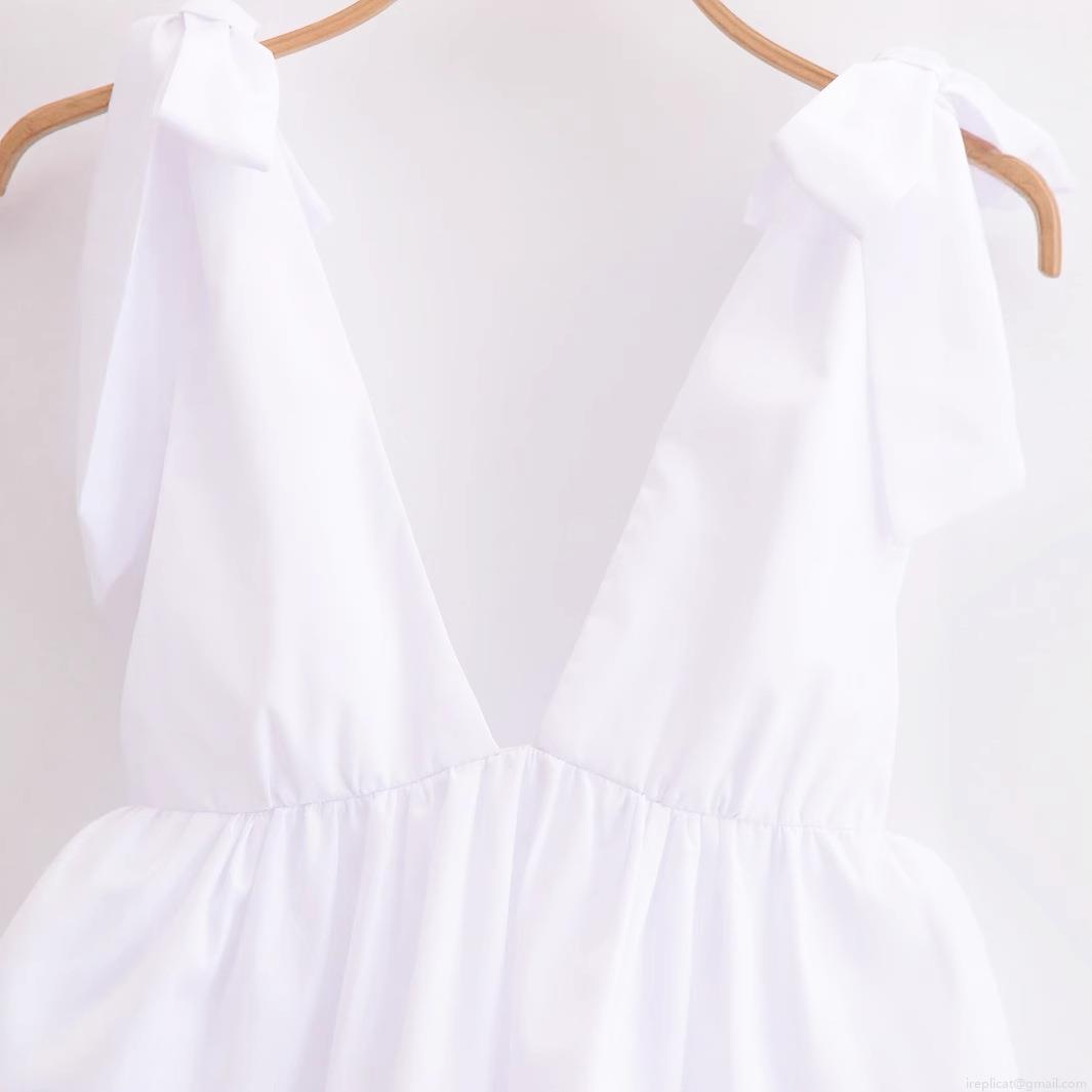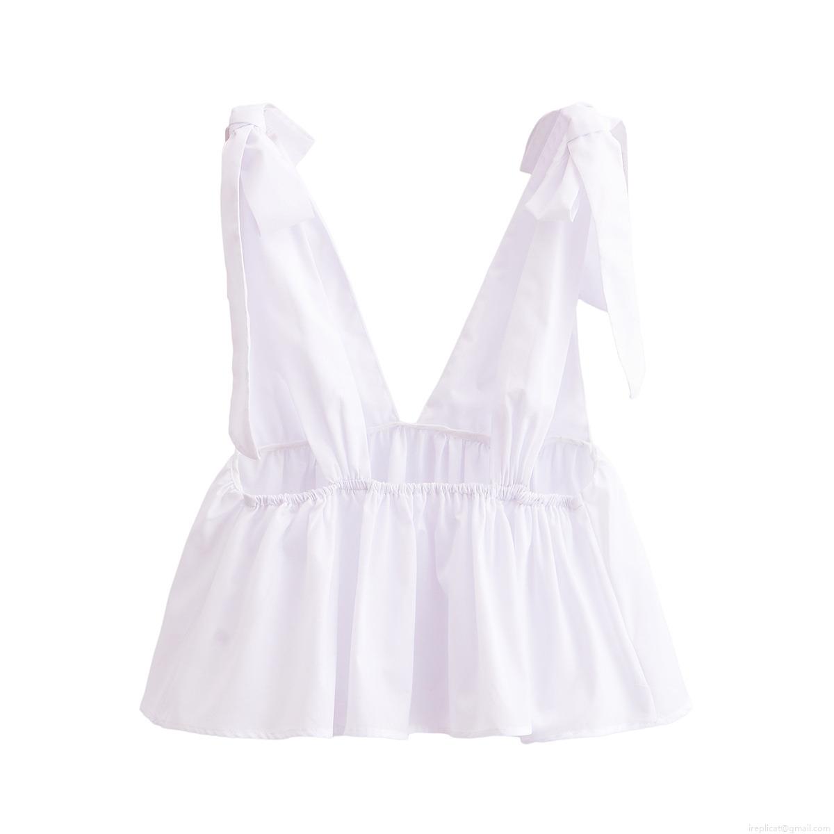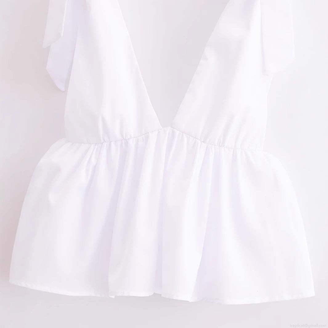 • Women's Sexy Deep V-Neck Bow Shoulder Tie Camisole Top Solid White 100% Polyester Peplum Hem Sleeveless Blouse for Summer Vacation Party Beach