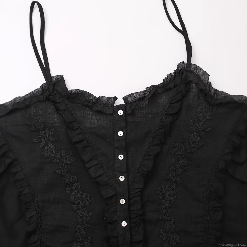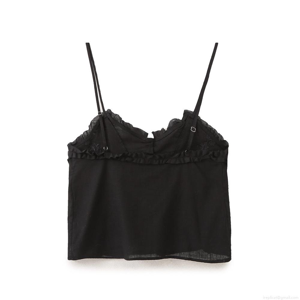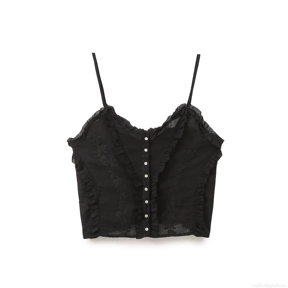 • Women's Sexy Floral Embroidery Cami Top Sleeveless Ruffle Hem Button Down Crop Top Adjustable Spaghetti Strap Cotton Blend Streetwear Black Top