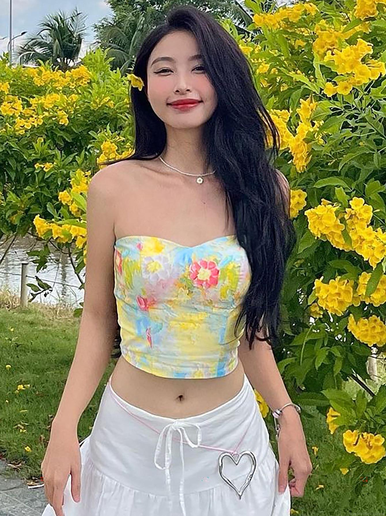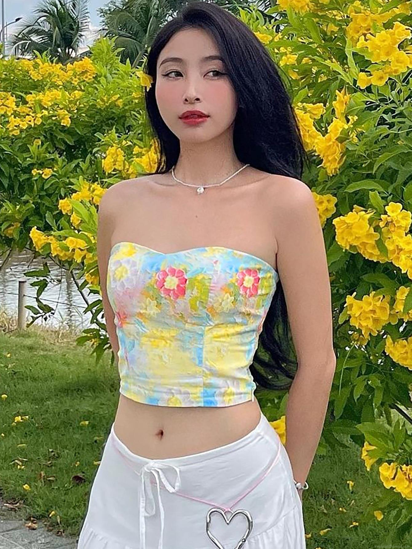 • Women's Sexy Floral Print Tube Top 95% Polyester 5% Spandex Strapless Crop Top Bohemian Summer Beach Corset Top Slim Fit Bodycon Bandeau Streetwear