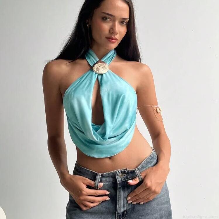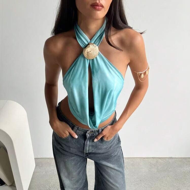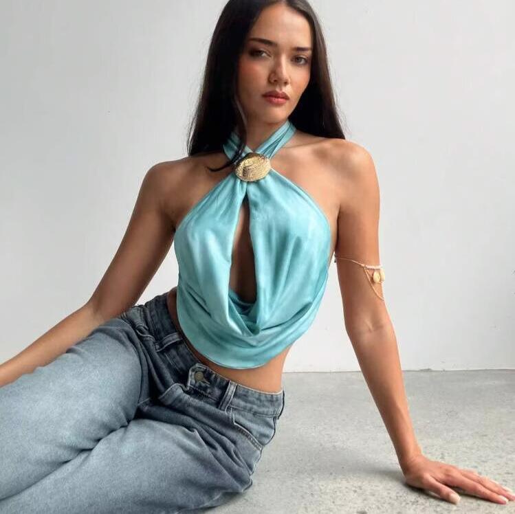 • Women's Sexy Halter Crop Top Satin Backless Cutout Camisole With Shell Metal Buckle Summer Beach Vacation Y2K Party Slim Fit Sleeveless Vest Tops