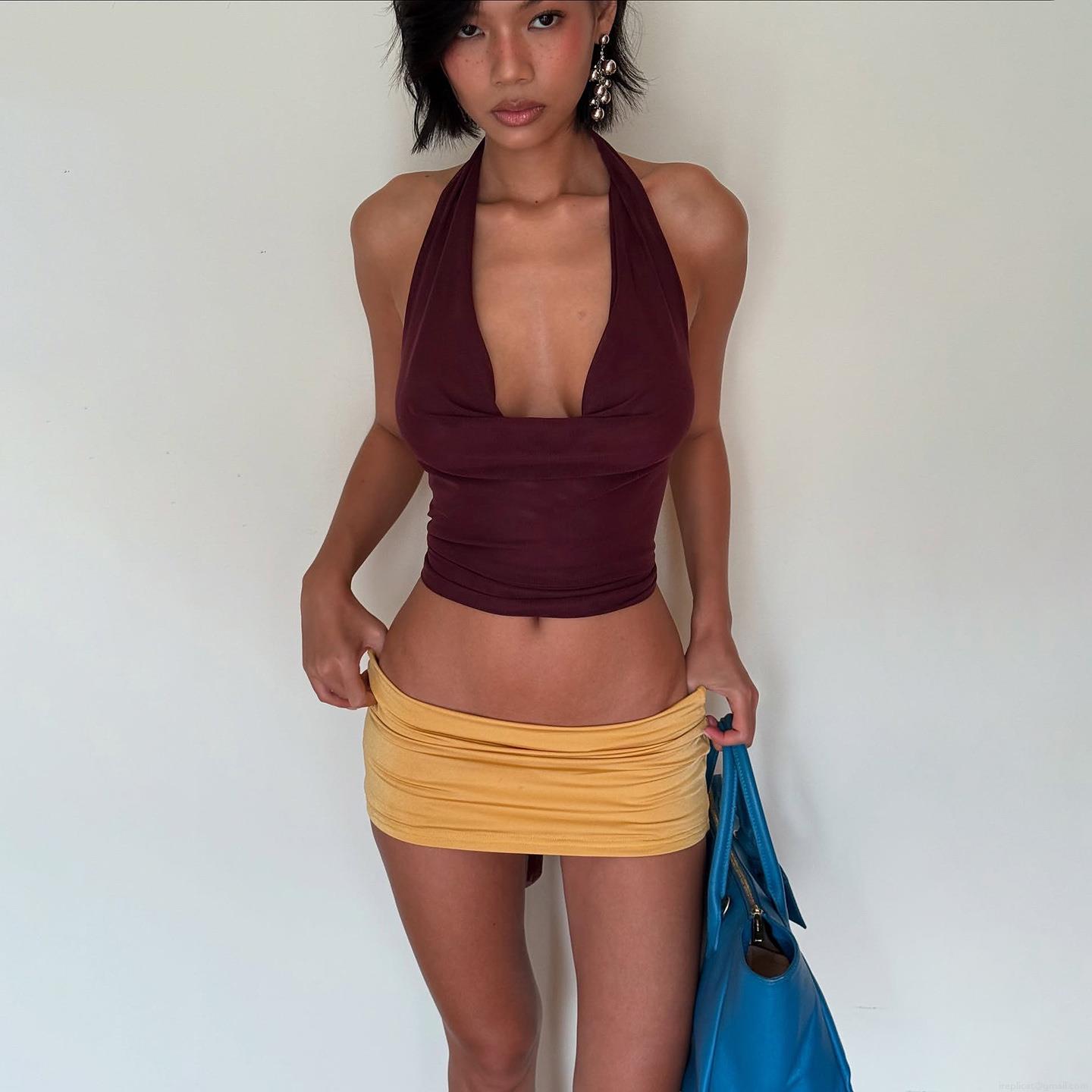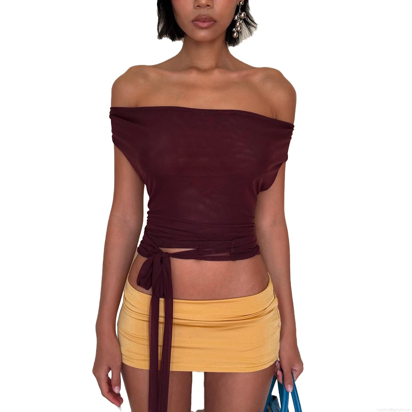 • Women's Sexy Halter Neck Backless Wrap Crop Top Mesh Ruched Tie Up Sleeveless T-Shirt For Party Clubwear Summer Fashion Bodycon Top