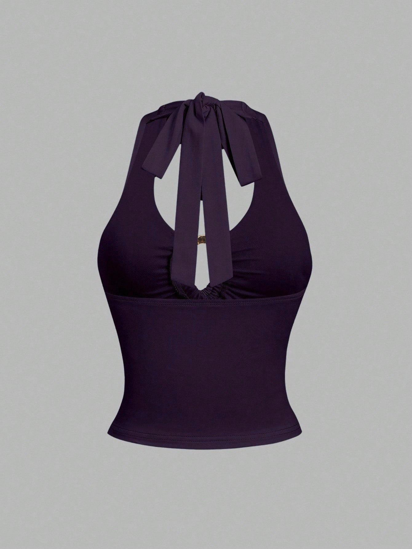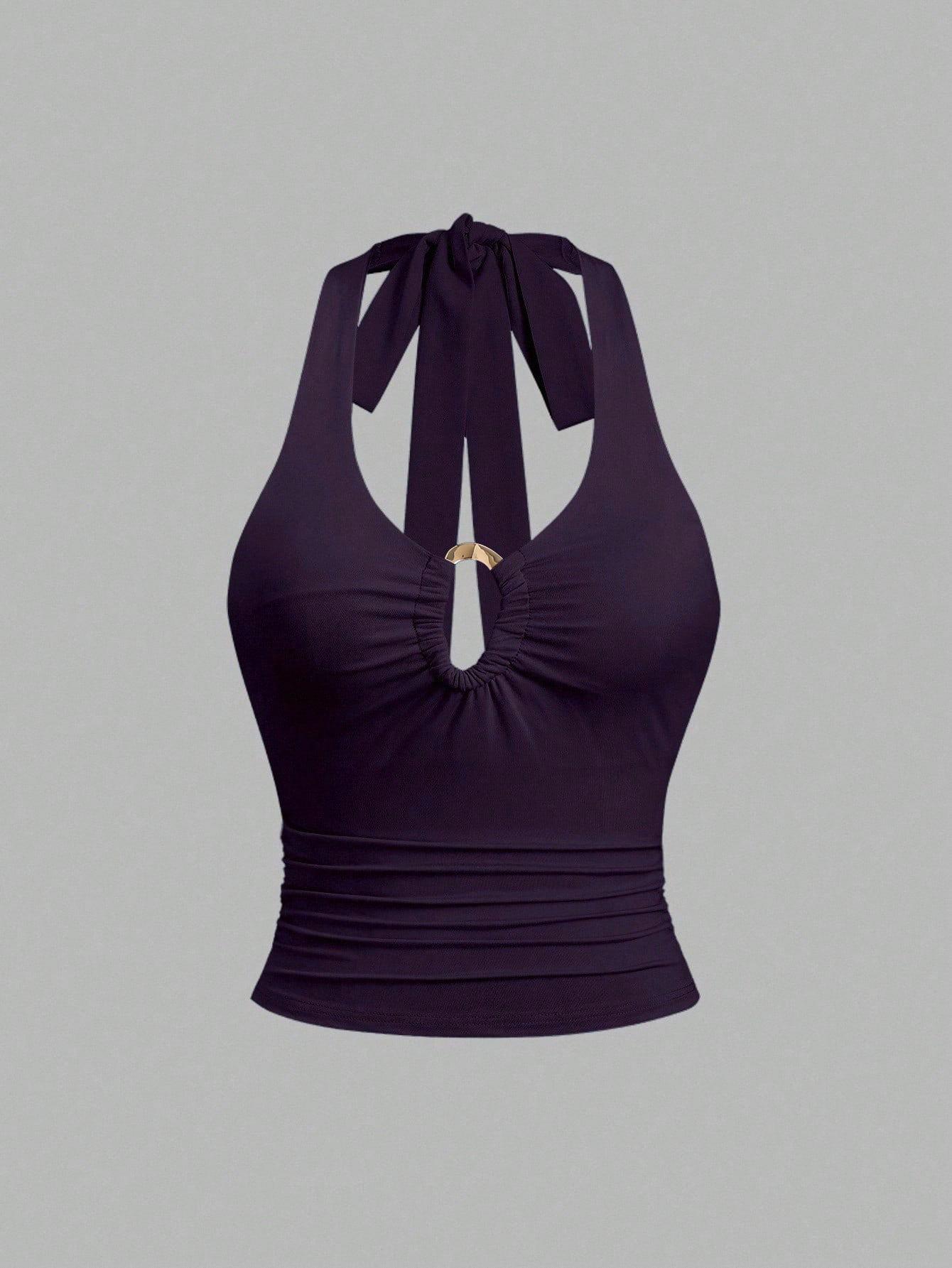 • Women's Sexy Halter Neck Camisole With Golden Metal Ring Polyester Elastane Slim Fit Cropped Tank Top Summer Sleeveless Backless Tie Up Vest For Party Clubwear