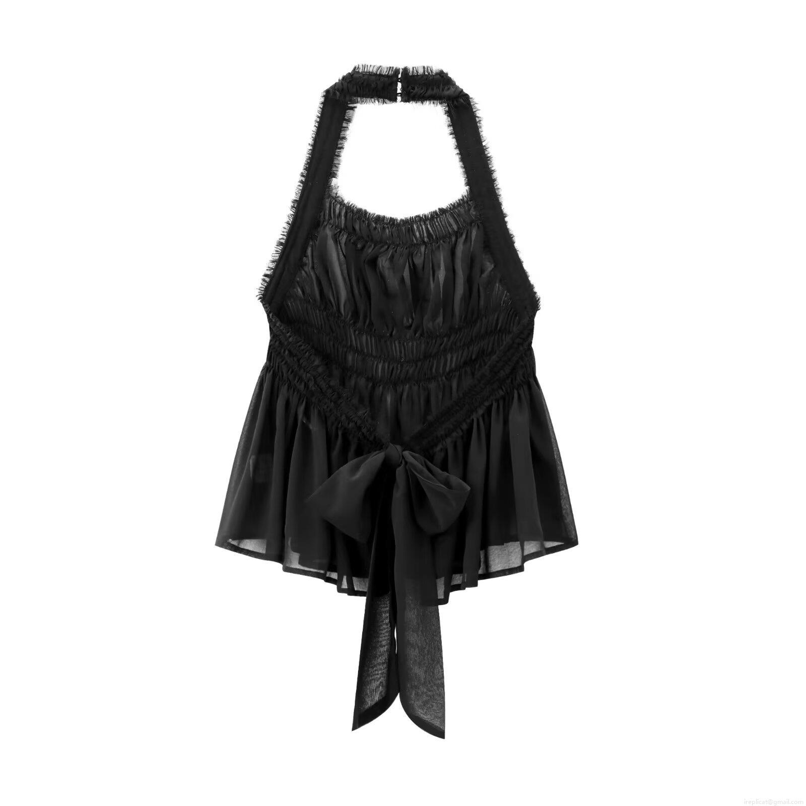 • Women's Sexy Halter Neck Pleated Chiffon Top Elegant Smocked Ruffle Camisole With Back Bow Tie Polyester Sleeveless Blouse For Summer Party Dating