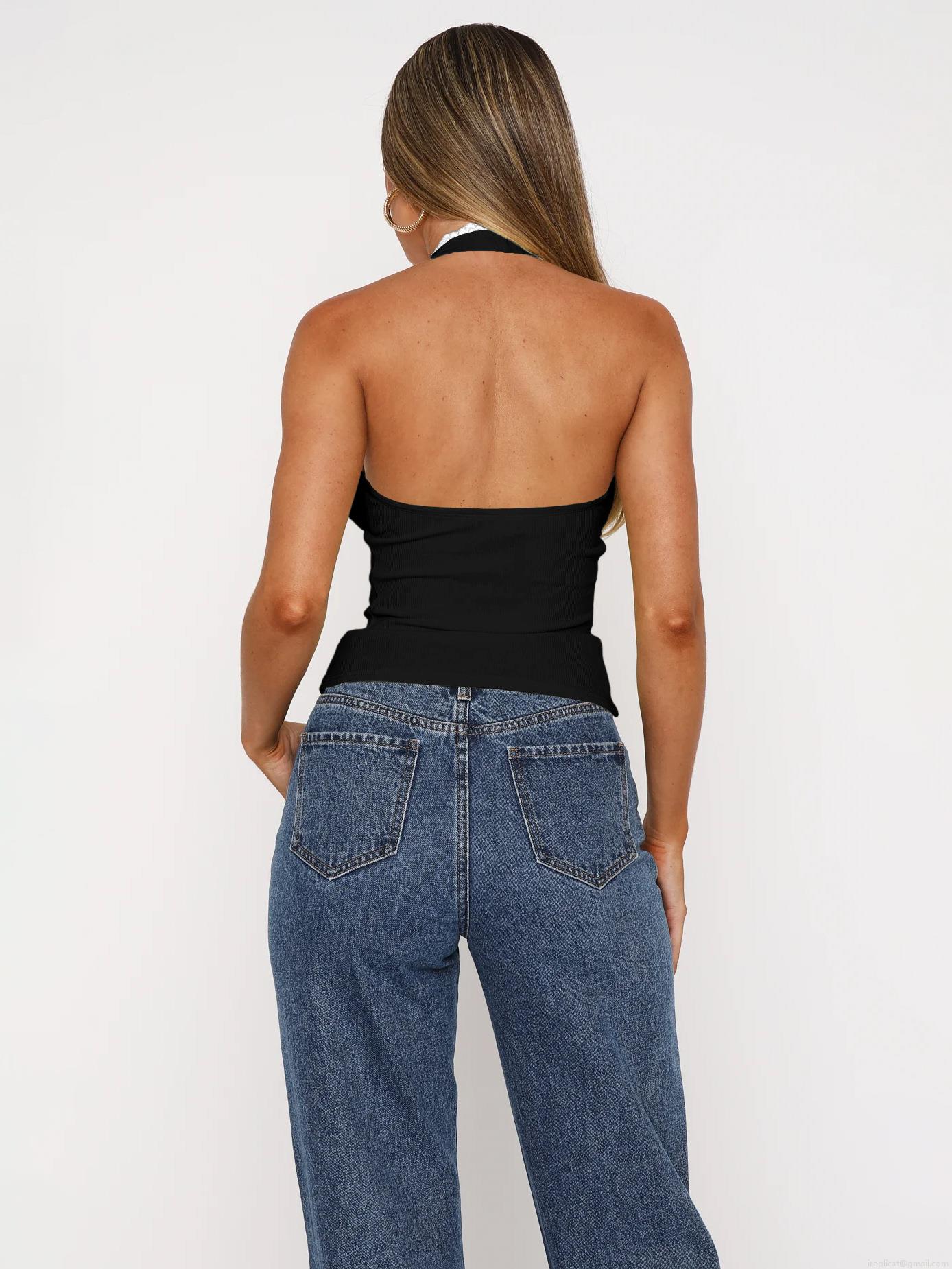 • Women's Sexy Halter Neck Ribbed Tank Top Lace Trim Backless Tie-Front Bow Cami Top Summer Sleeveless Streetwear Slim Fit Top Clubwear