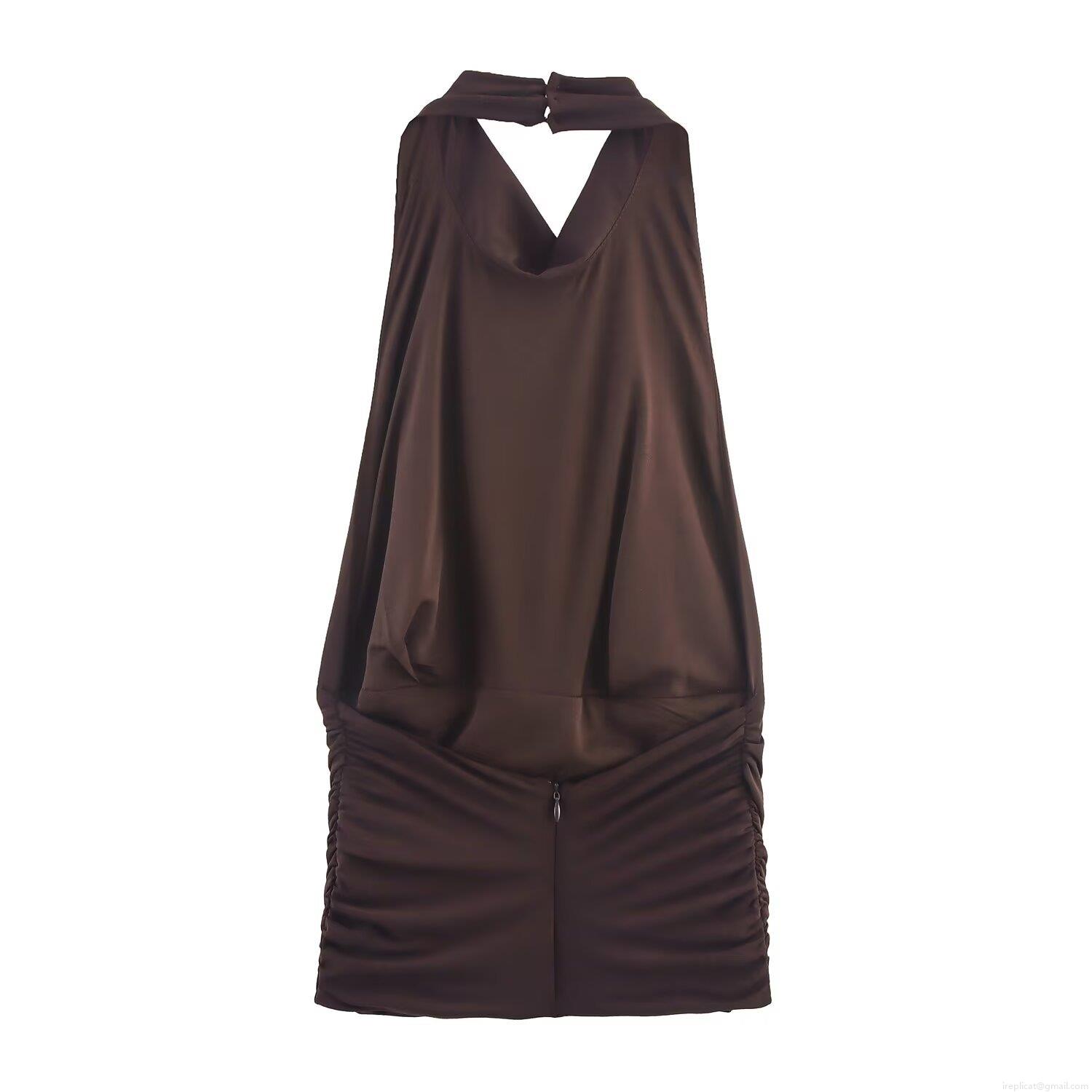 Women's Sexy Halter Neck Ruched Top Cowl Neck Sleeveless Slim Fit Pleated Backless Coffee Brown Polyester Shirt For Summer Party Clubwear