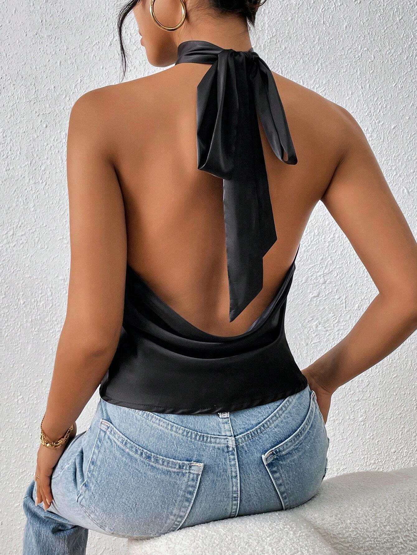 • Women's Sexy Halter Neck Satin Tank Top Backless Slim Fit Sleeveless Top With Bow Tie Neck For Summer Party Date Night Clubwear