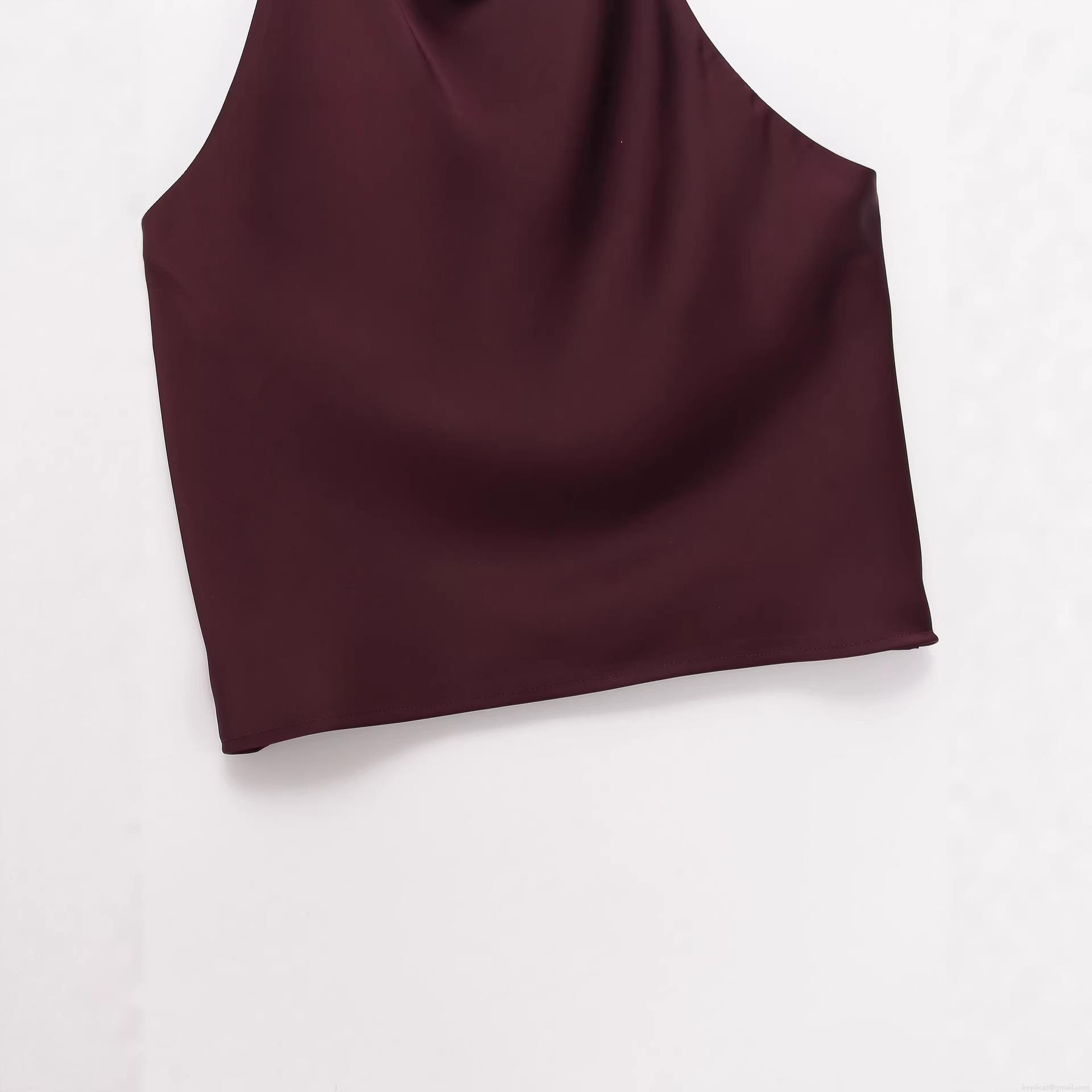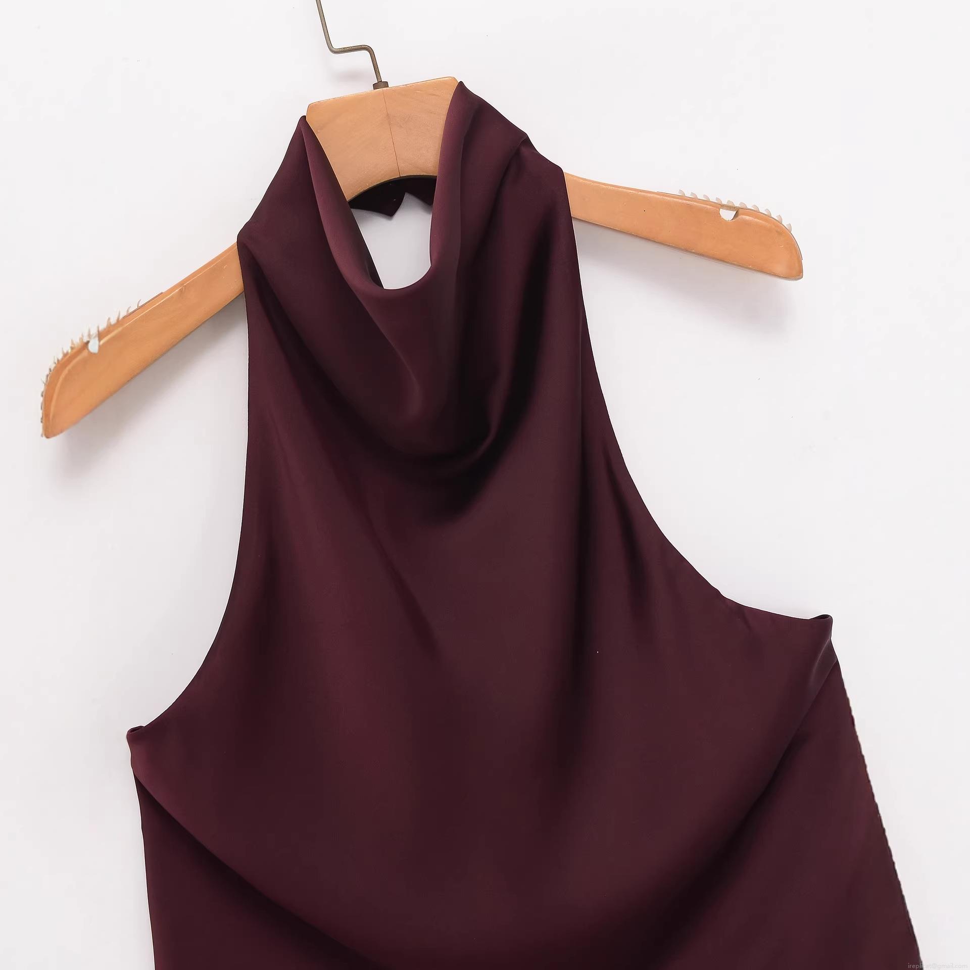 Women's Sexy Halter Neck Satin Top Elegant Wine Red Sleeveless Backless Silk Texture Tank Top For Party Club Summer Solid Color Vest