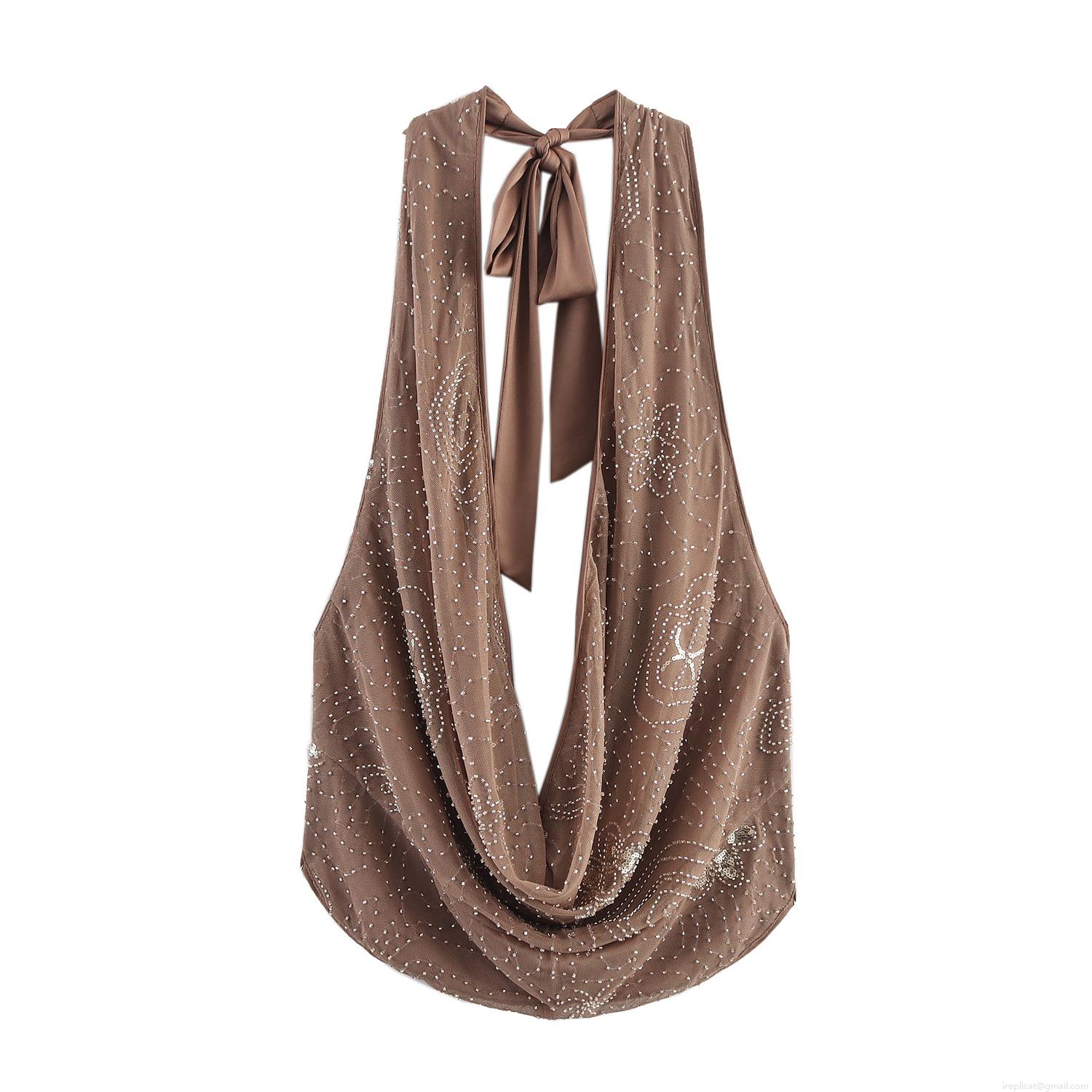 • Women's Sexy Halter Neck Top Beaded Mesh Cowl Neck Camisole Backless Y2K Chic Satin Top for Music Festival Party Coffee