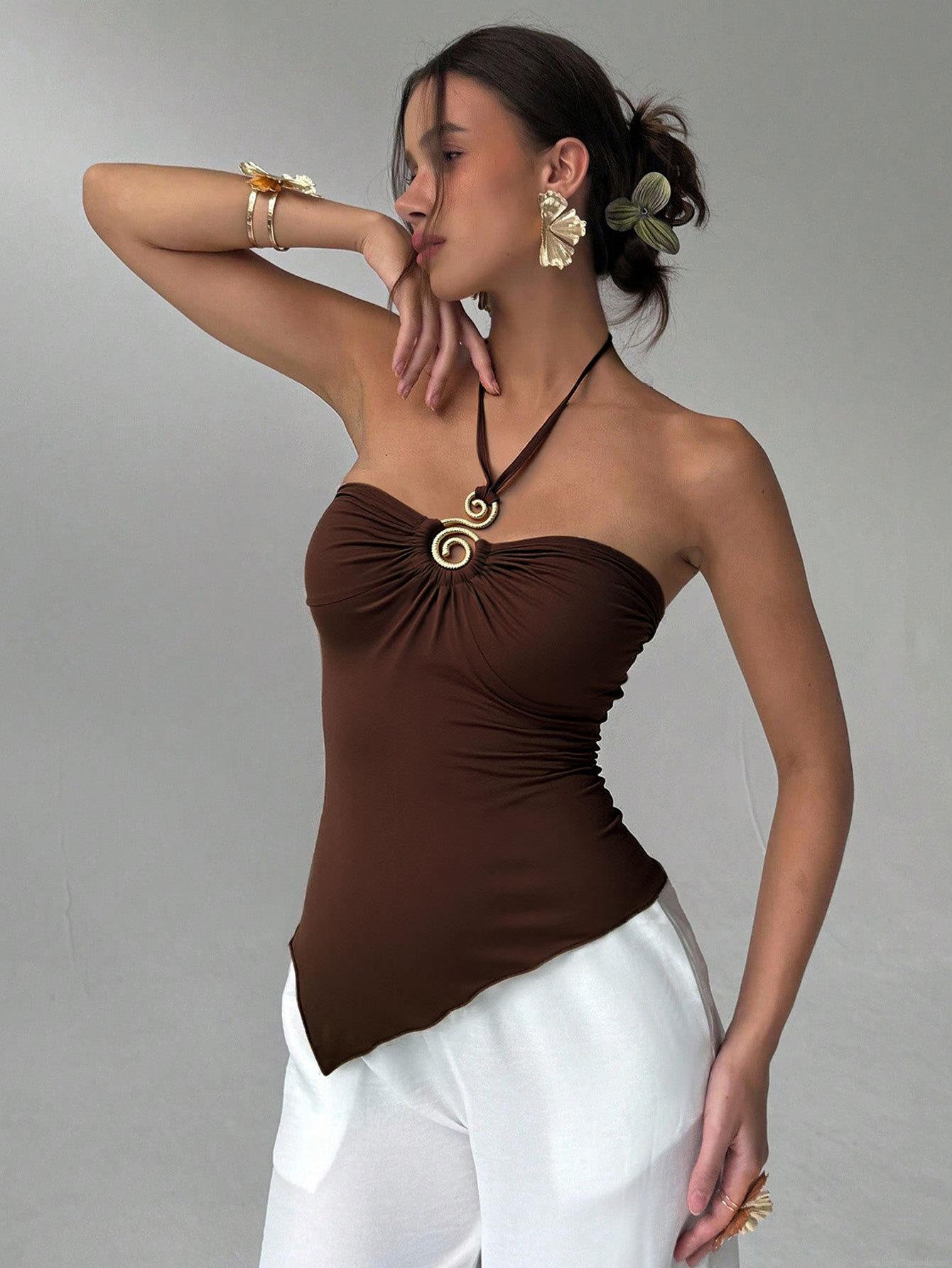• Women's Sexy Halter Neck Tube Top Backless Slim Fit Short Vest With Metal Decoration Summer Sleeveless Polyester Solid Color Tank Top For Party Clubwear